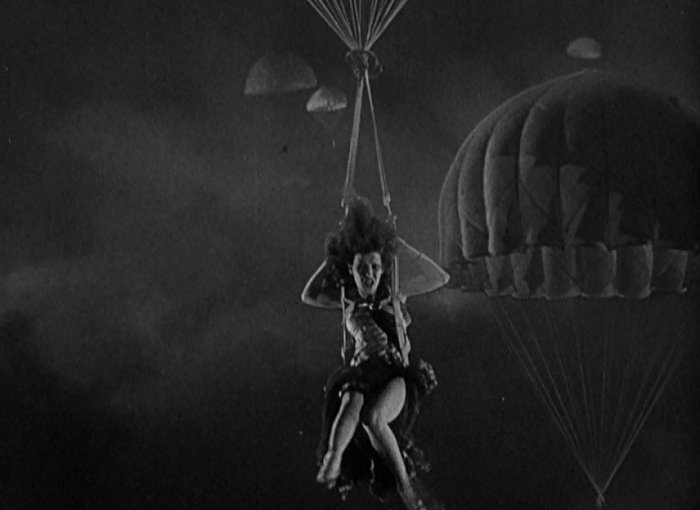 When a sudden electrical storm suddenly appears, it shakes the giant airship off its moorings and it slowly begins to break up. The crew hurriedly begin hustling all the passengers into parachutes to make their escapes. The scenes of people in costume scrambling around to don their shutes and get thrown out of the gondola by the air crew has to be seen. Really wild. Meanwhile, wife takes off her mask, reveals her identity and hubby realizes what a fool he’s been. He, like everyone else, makes it off the shop and the flick ends with them back in their luxury apartment with him vowing to never stray again, while she also promises to be more carefree and recapture the fun they had while courting.