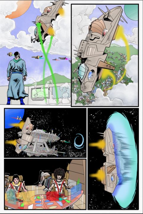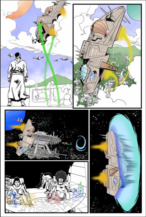 Artist Andrea Bormida has colored Pg # 16 of book # 2. Wahooo! Our heroes are about to start their voyage to learn the secret of the alien technology and hopefully safe the universe.