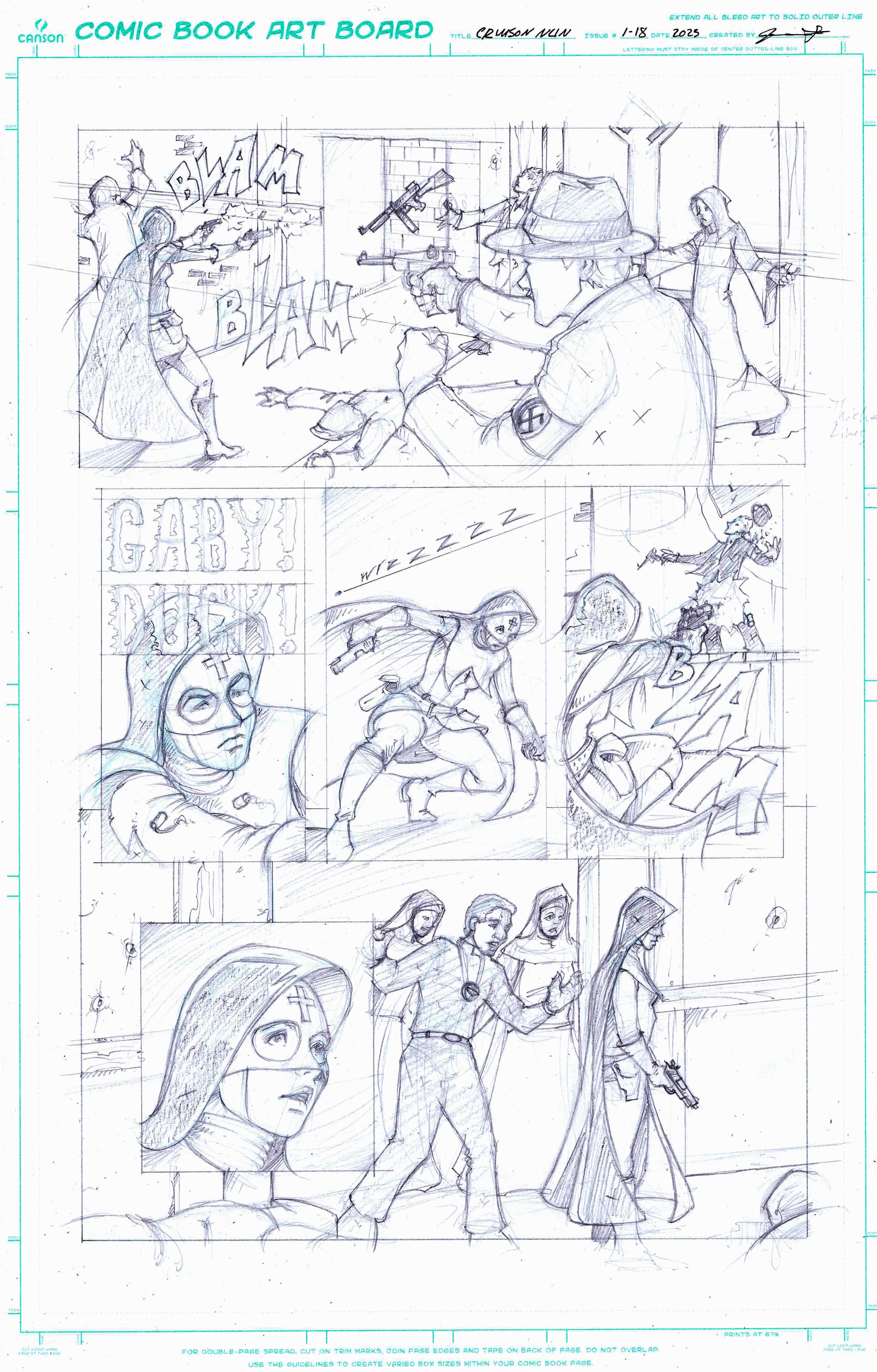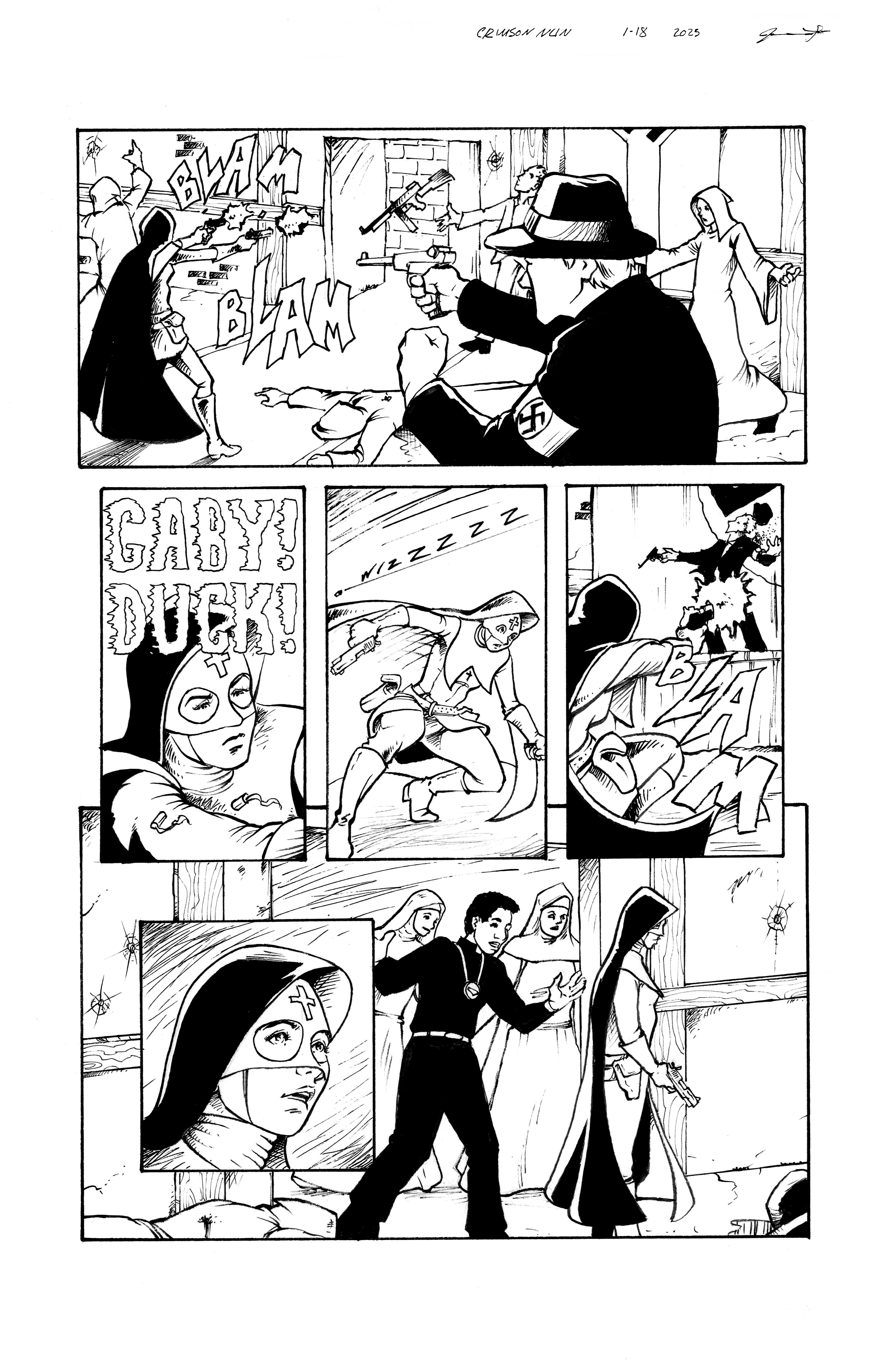 Artist Jesse Thomas continues to amaze us with his work on The Crimson Nun issue # 1. From pencils, to inks to colors, he’s doing such an amazingly beautiful job with this project. Can’t wait to have it finished and off to Antarctic Press and finally into your hands, Loyal Airmen. Stay tuned.
