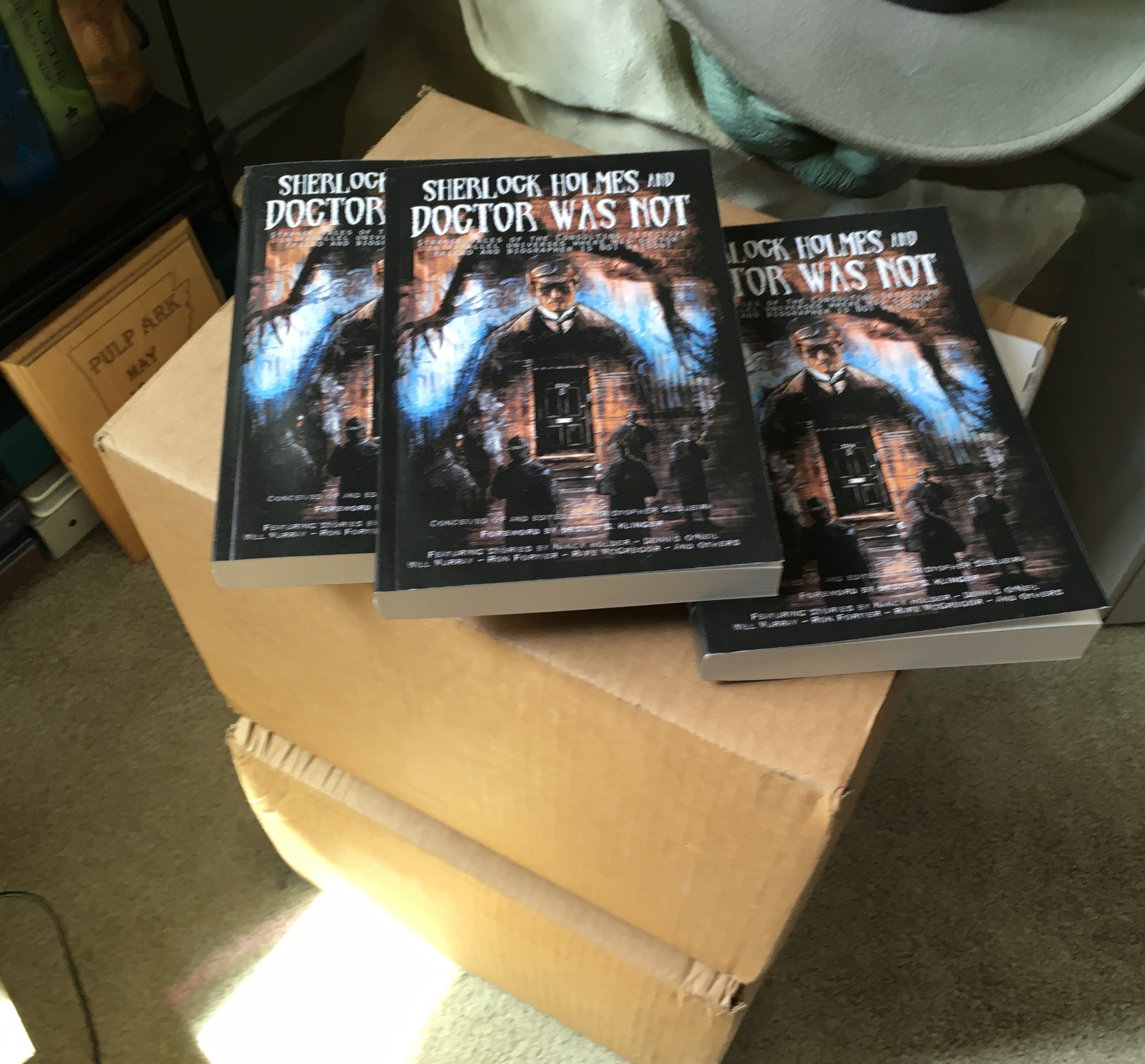 When editor Christopher Sequeira asked how we wished to be paid for my Sherlock Holmes story now in the new anthology, “Sherlock Holmes and Doctor Was Not,” we asked if instead of cash, we be paid in copies. This afternoon two hernia inducing boxes were waiting for us at the post office. Oh yeah!! The Air Chief now has lots of copies and can’t wait to put them out on our table at the rest of the cons we will be appearing at this year. Am so damn proud of this book. Thanks again, Chris.
