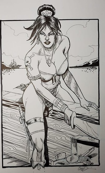 One of the things we love to do here is every so often showcase some really wonderful artwork by our comics colleagues. Above are two really wonderful pieces. The dinosaur is by Jeff Slemons, our neighbor here in Fort Collins, who is doing a series of them for a project. If you are on Facebook go to his page and check out a few others. While the other is of a beautiful pirate queen as done by my friend (and partner) Cesar Feliciano of Florida. Cesar is the talented the Air Chief is doing the new graphic novel series, JIN & TONIK with. We thought you’d enjoy seeing these.