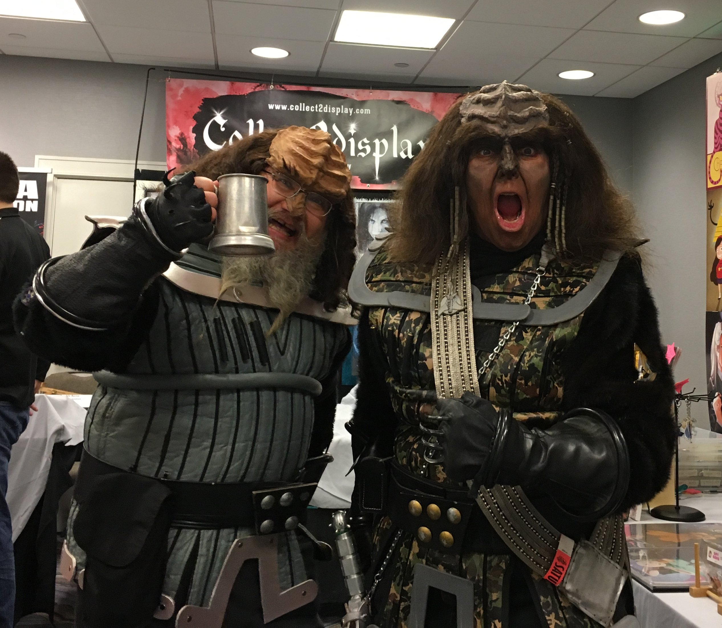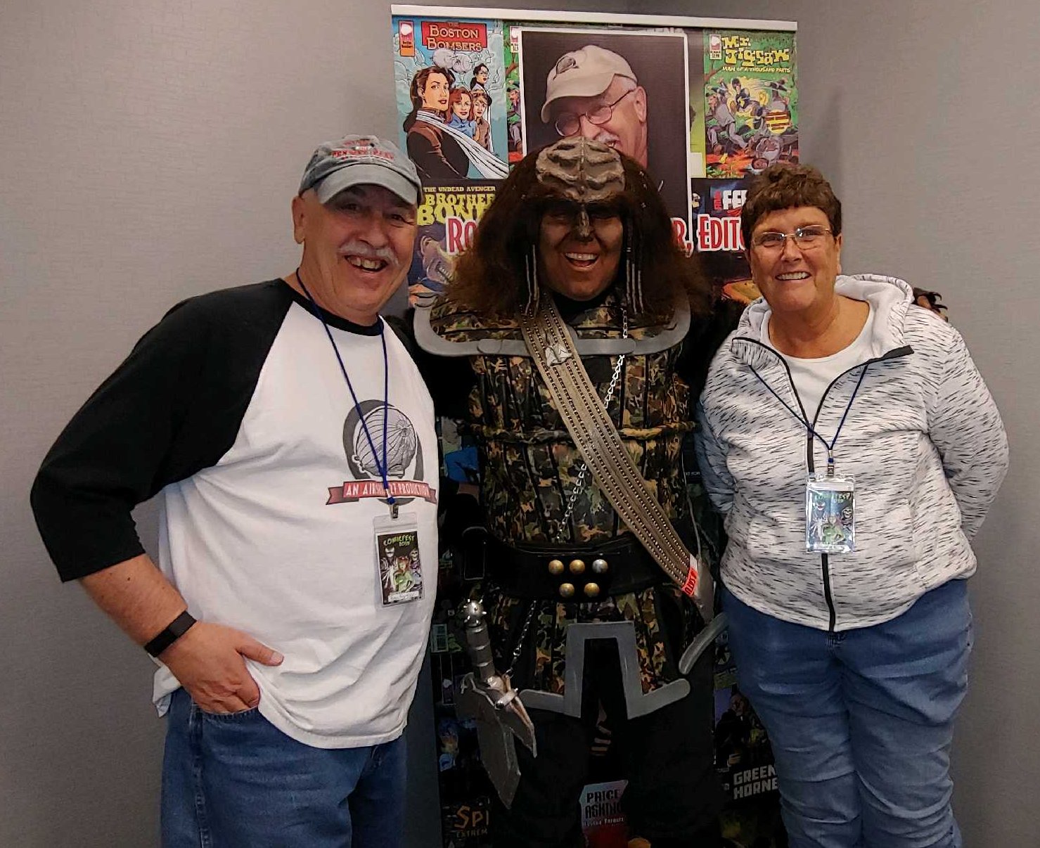 Naturally one of things we can always expect at any comic or sci-fi con these days are the fans dressed up in costumes from various movies and TV series. Known by the slang-term cosplayers. From the start of the show we met the husband and wife team of Gary and Amy Nelson who showed up as Star Trek Klingons. Their outfits were simply fantastic and we had to snap these pictures. They are a wonderful couple and ended up buying lots of the Air Chief’s books and comics.