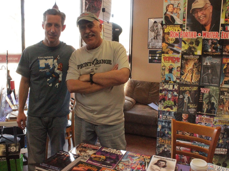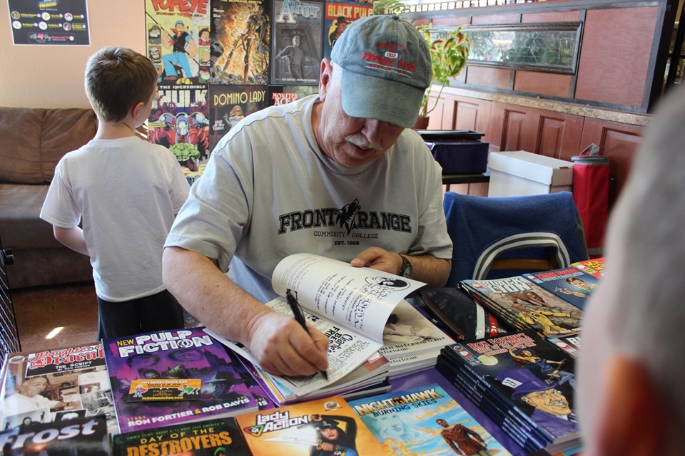 And here’s Abe at his own table talking to a local fan and his daughter, while back by the front entrance, artist Lee Oaks and the Air Chief took a second to pose for the camera. Behind us is our colorful banner.