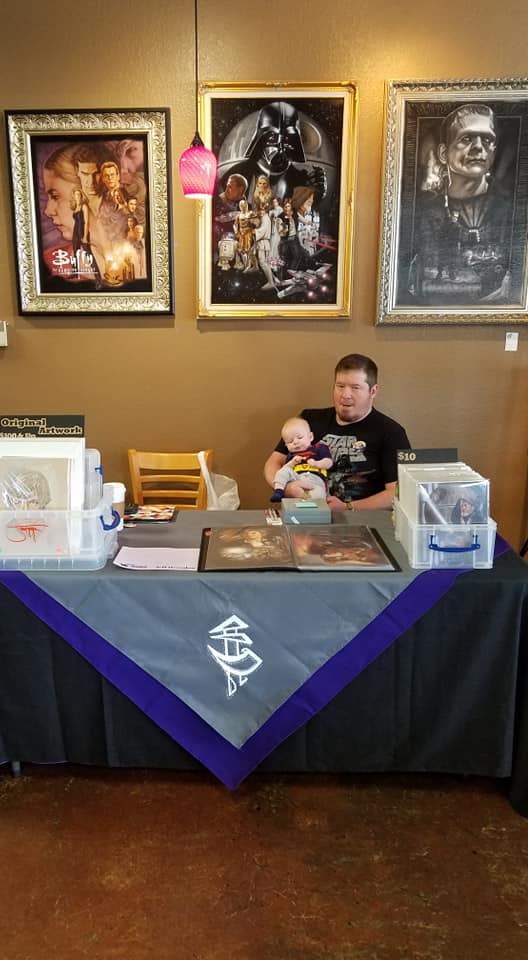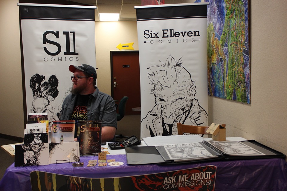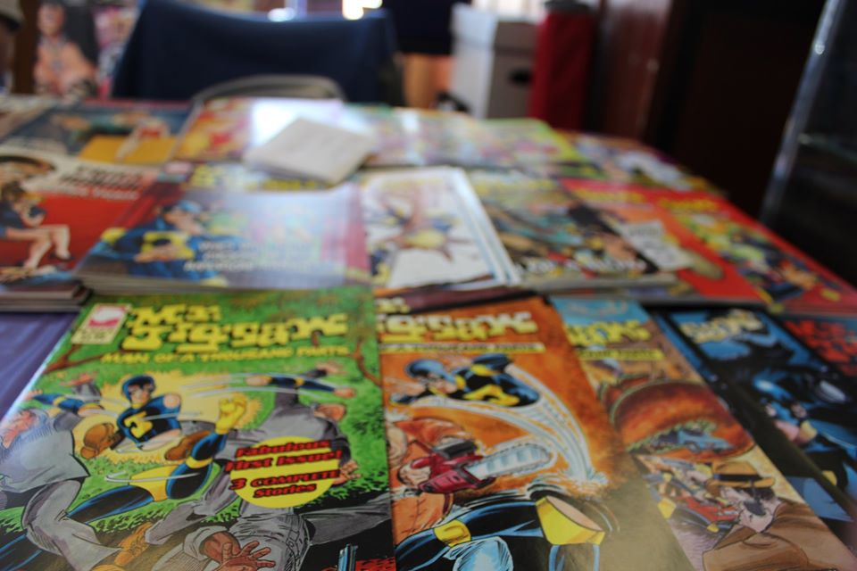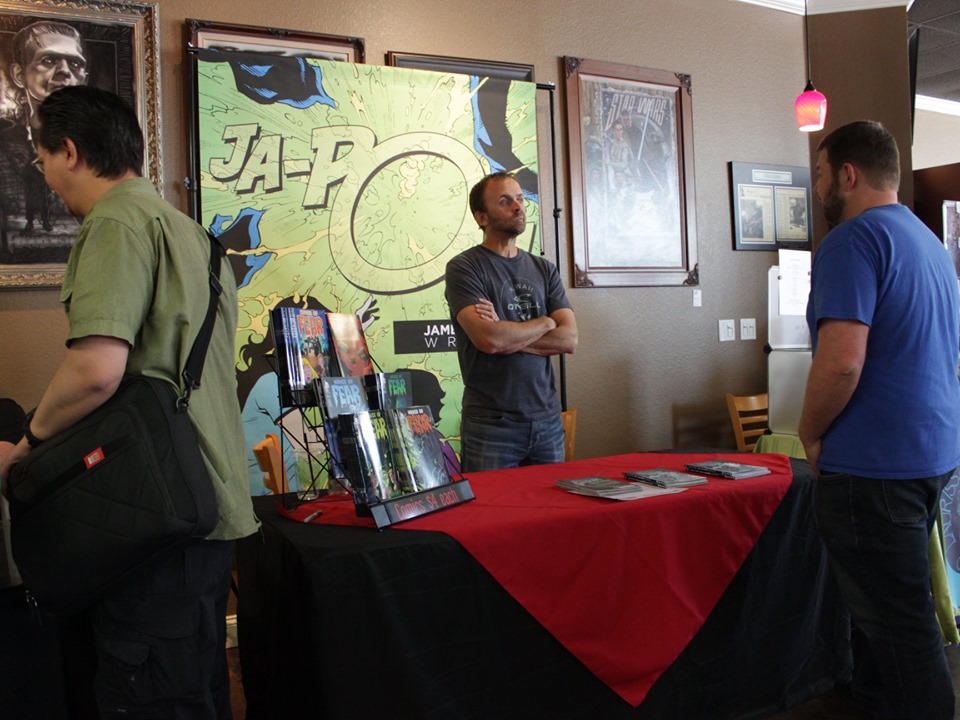 As ever our table was overflowing with comics like our popular Mr.Jigsaw Man of a Thousand Parts series, and we also had some of our pulp titles to included Brother Bones the Undead Avenger. Here we are signing an issue of Mr. Jigsaw for a young fan while Lee’s son, Jonas, takes a second to look at all the covers on our banner.