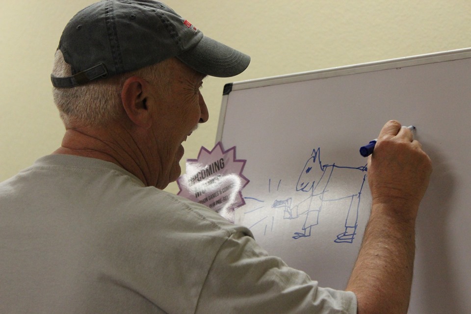 First such challenge was to draw an armor wearing goat…which resulted in a draw by the show of hands. So we went into a second round to draw a merged penguin & ostrich, to which Todd easily won. Leaving the Air Chief laughing to the point of tears.