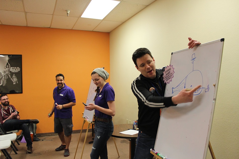 We so love meeting young boys and girls whose parents encourage them to read. It is that kind of guidance and support that will enrich their lives. And we need to acknowledge the one person responsible for coordinating all us writers and artists in appearing at the shop was my Official Protege, writer Todd Jones. Beside all the other activities going on that day, Todd organized a madcap contest called The Draw Off, where every creator, be it writer or artist, had to draw vs another creator….much like pictionary, only on a larger scale. Above, Todd and the Air Chief take suggestions from the audience as to what we should draw…or at least attempt to draw.