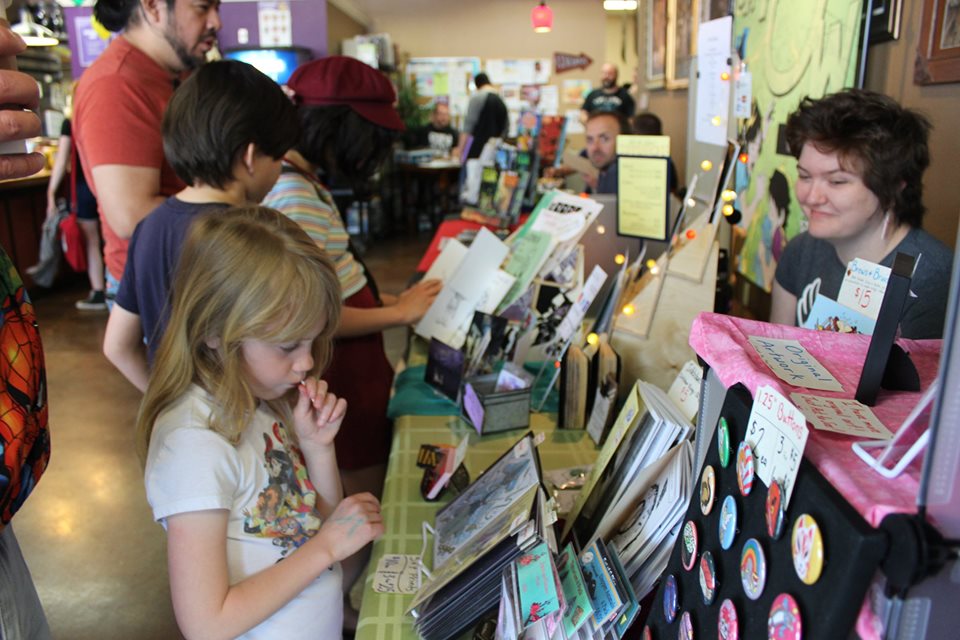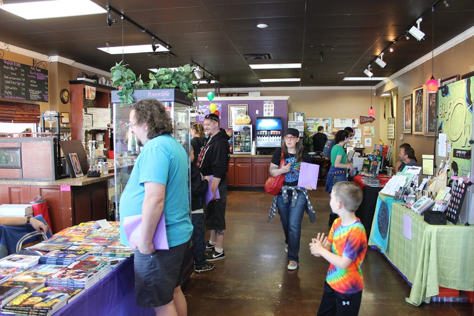 Around the corner we had artist Tom Webster, at upper left, with one of the staff at the shop. Then the photo to the right shows artist Laurissa Hughes talking to young fans. Laurissa and her partner drove all the way up from Denver to do this show with us.