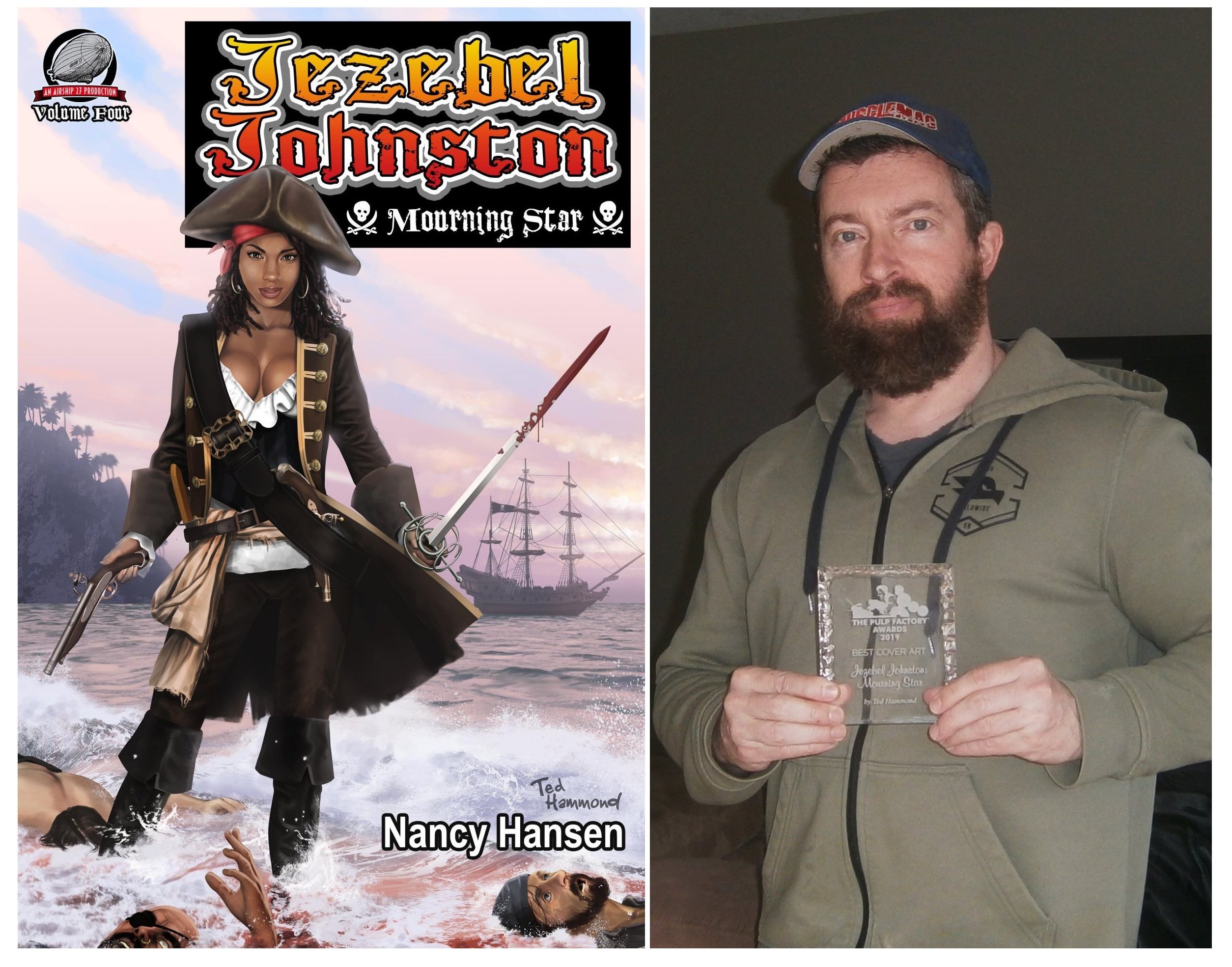 Earlier this year, Canadian artist Ted Hammond won the Pulp Factory Award for Best Pulp Cover of 2018. The cover was to Airship 27 Productions’ “Jezebel Johnston – Vol 4, Mourning Star” by Nancy Hansen. We are now thrilled to announce that Ted has signed on to do the cover to the 5th book in the series, “Jezebel Johnston – Vol 5, Danseuse” currently in production. Here Ted shows off his award. Once again our congratulations to him and all the PFA winners.