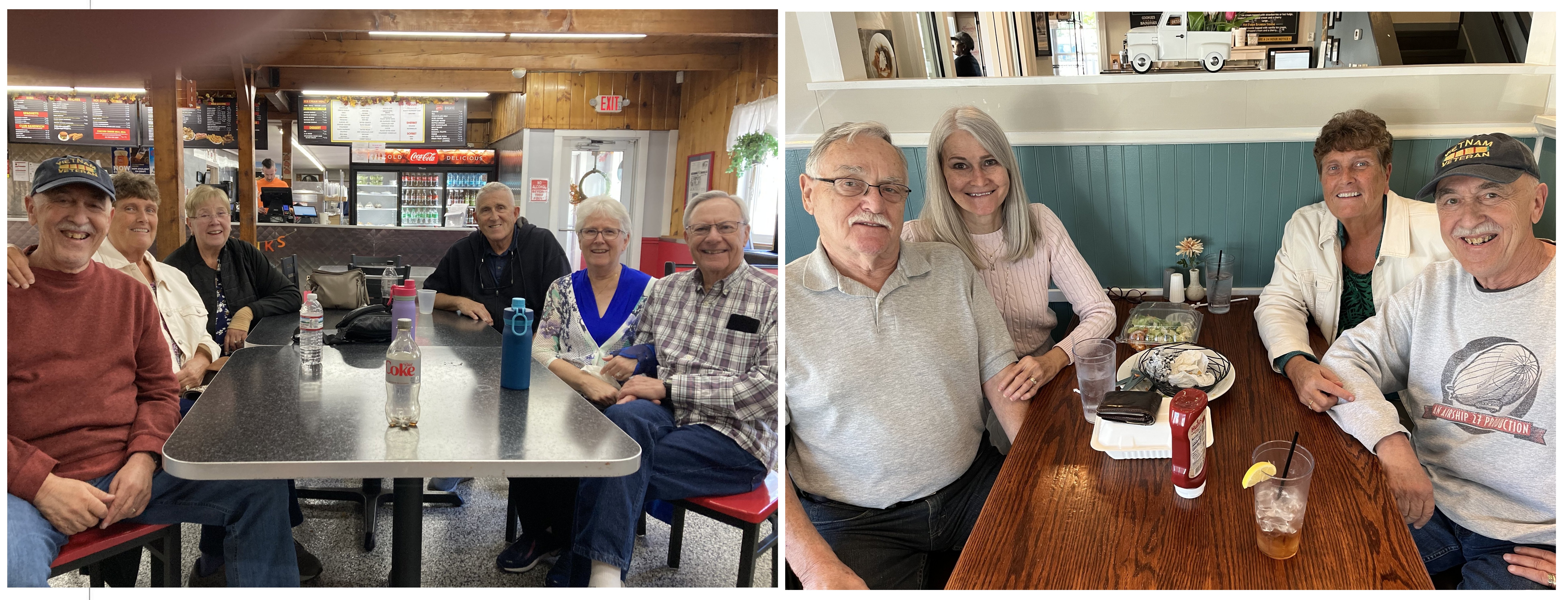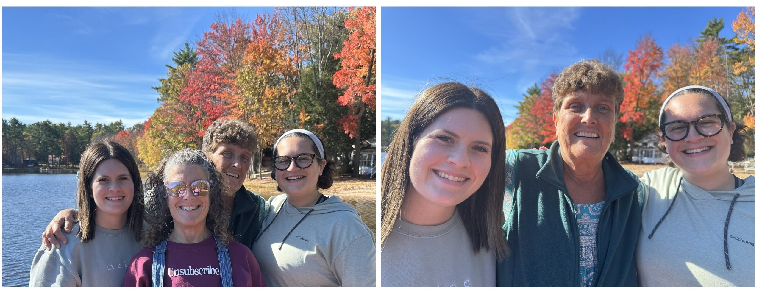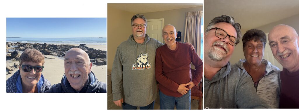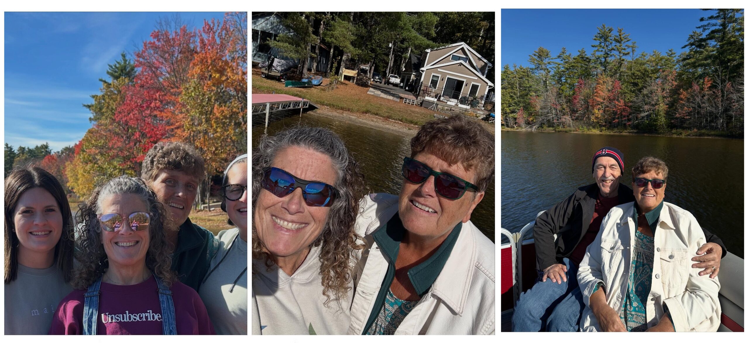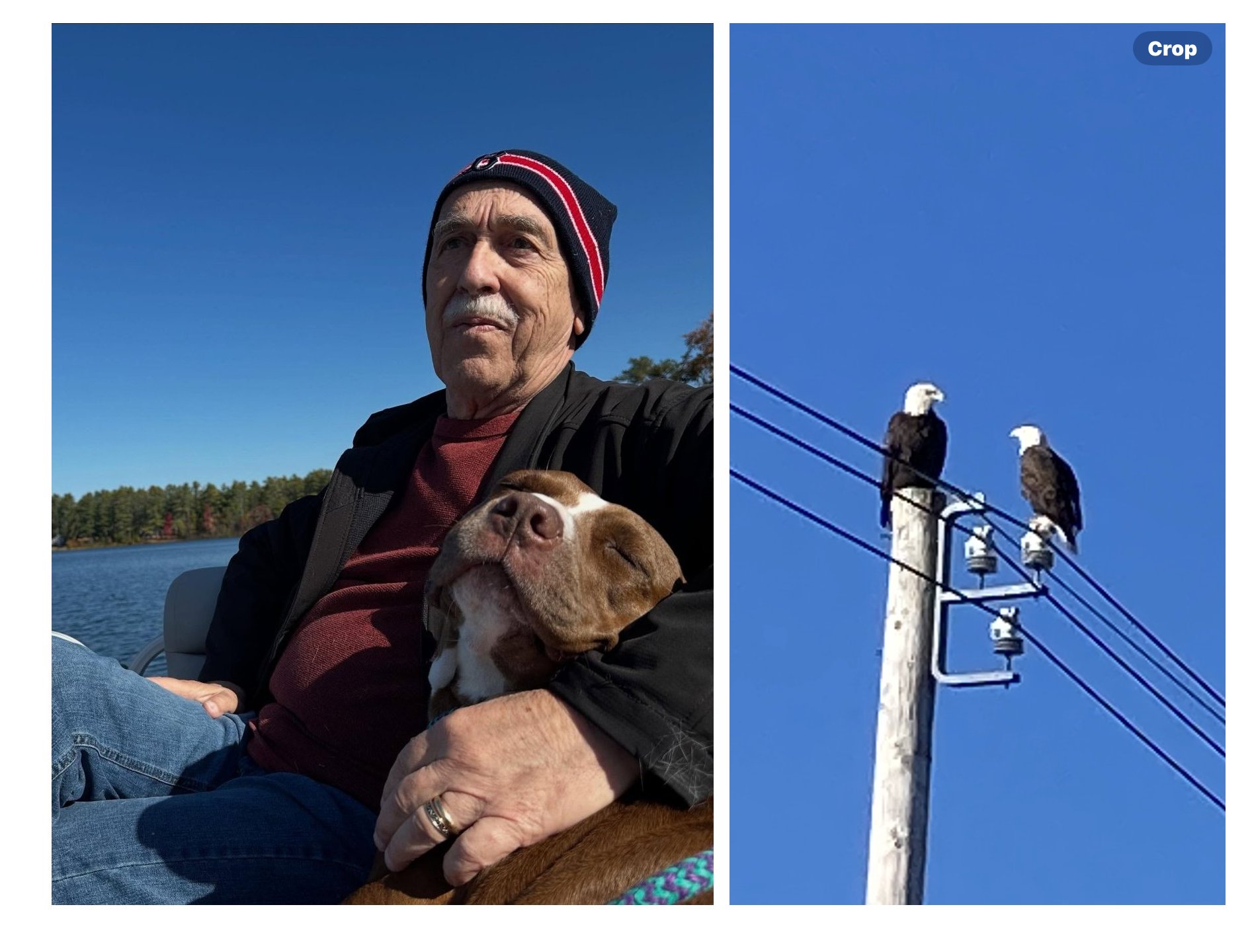 Greetings Loyal Airmen, well the past three weeks in Maine have come and again. Just like that. Oh yeah. Valerie and the Air Chief has so much visiting with family and friends that we hadn’t seen in over a year, some two. As always, we stated in Wells Beach, ME. as is evidenced by that first pix above at left showing us enjoying the Atlantic Ocean. Note, while there we ate lots and lots of fantastic seafood from sea scallops to clams and haddock. Three days in, oldest son Scott, drove all the way up from his home in Bethel, Conn. to spend a day with us. It’s always so wonderful to see him and get caught up on how is family is getting along. We treated him to a lunch at Billy’s, a seafood diner just down the road.One highlight of our visit was visiting our daughter Michelle and her husband Chris who live in a beautiful lake house in Acton. Granddaughters Chelsea (at left above) and Kristi (cut out at far right) framed Val in background and Michelle in front for generational pix. Then we have Michelle and Val just as we were about to get aboard Chris’ pontoon boat for a trip around the lake. Aghhh….accidentally trimmed the group shot above so redoing it here. Left to right, Chelsea, her Mom Michelle, Val and Kristi. And of course Val with grand daughters Chelsea & Kristi and check out that gorgeous Fall Foliage in the background.Of course visiting family and friends was the focus of the trip. Pix at upper left has (left to right) Air Chief, Val, her sister Barbara and husband Gus, then her sister Sandy and husband Andy. Pix on the right, (left to right) my dear friend Ron and his wife Kim, and then Val and the Air Chief. Note, both were taken at two separate restaurants specializing in seafood. Oh yeah.And finally we thought it would be fitting the end these photo memories with two dealing with some very special creatures. A while back our daughter Michelle rescued an abused dog named Rosey. She had suffered a great deal before Michelle came along and gave her the love she deserved. Rosey is a beautiful Rottweiler and she and the Air Chief became fast buddies. Also, on our very first day in Wells, while walking along the mile road to the beach, we looked up and spotted two majestic bald eagles taking a rest atop a telephone poll. Val immediately snapped the pix above. And that dear Loyal Airmen are only a few of the dozens of great memories we made these past few weeks. Hope you enjoyed them.