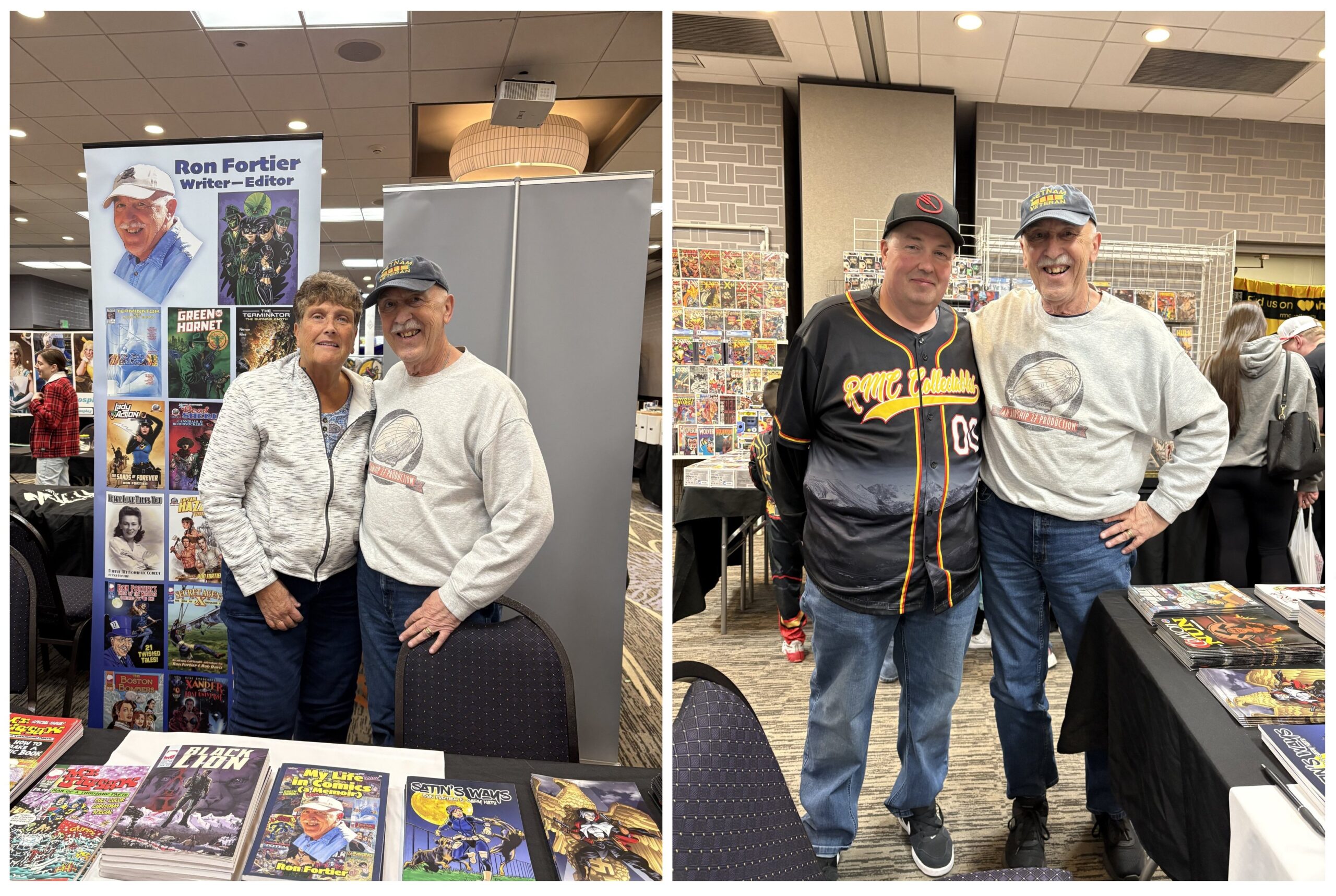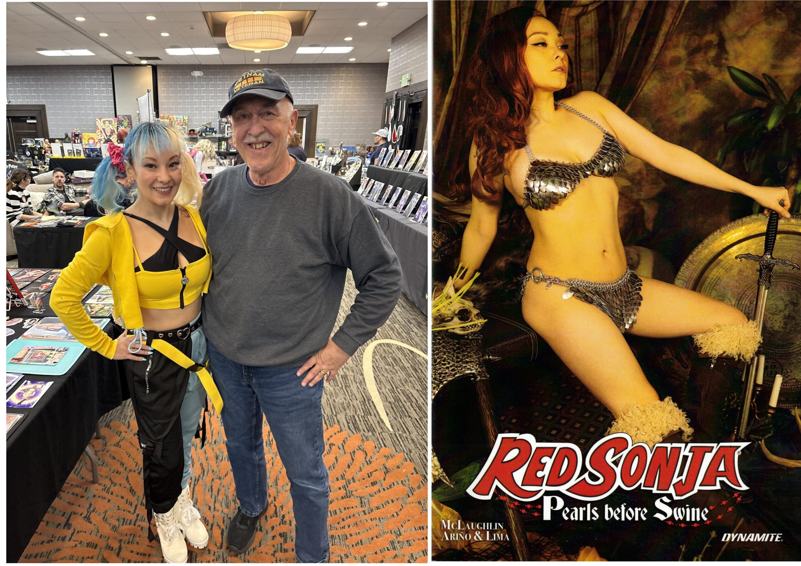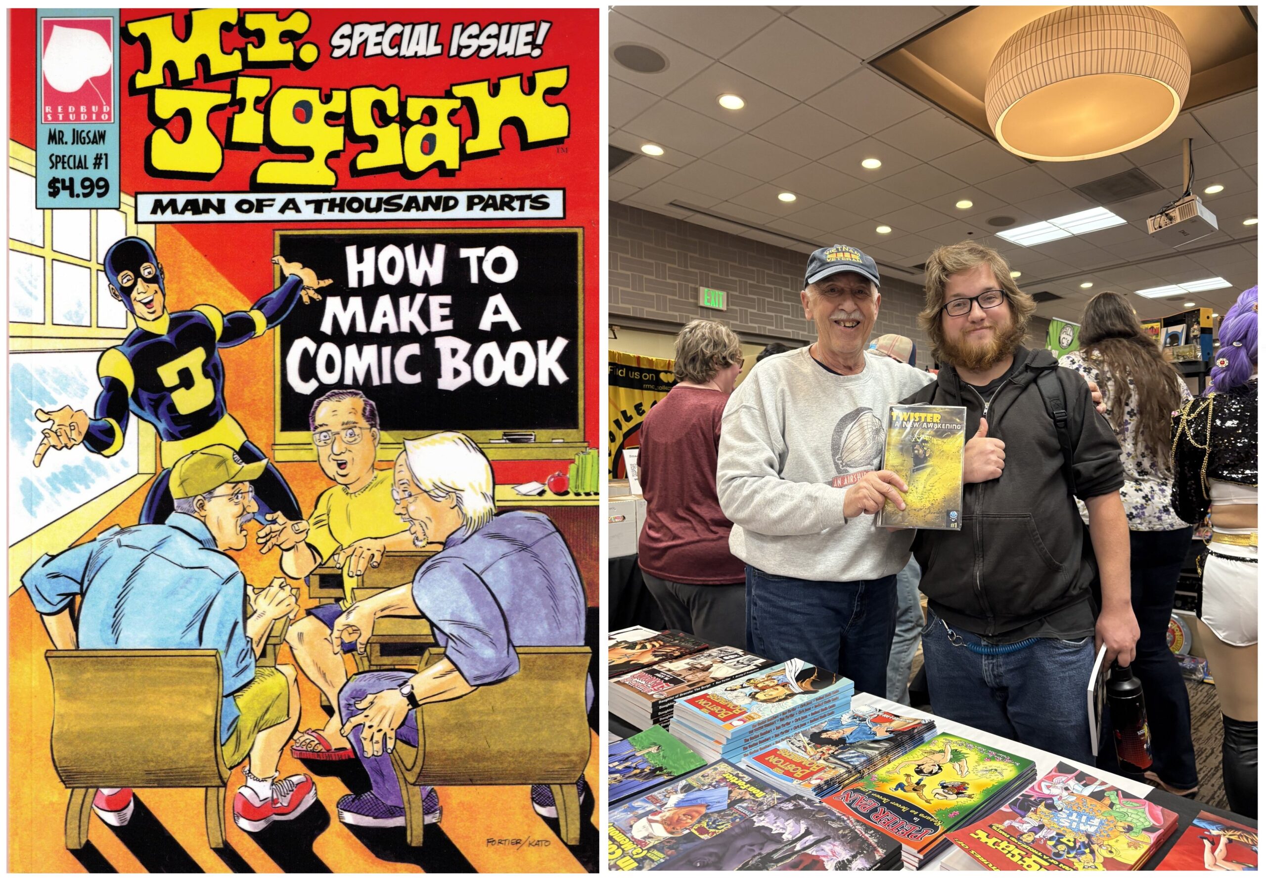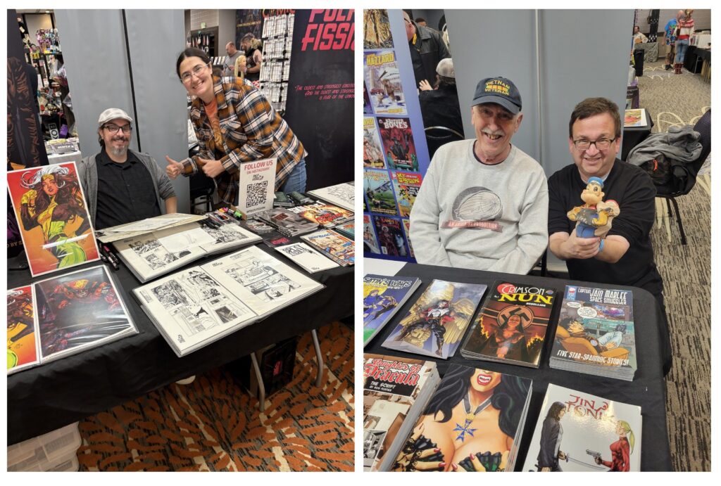 Every time our birthday rolls around, we know it’s time for our favorite comic con ever, The Rocky Mountain Con, as created and promoted yearly by our Denver amigo,Tim Moret. The show, since its inception eleven years ago has always been for one charity or another. The past few years, Tim has supported Caps for Kid, a group that helps research to eliminate pediatric cancer. Val and the Air Chief have been participating since day one and this year’s gathering was as much fun as ever. And we’ve a few fun stories to share with all you Loyal Airmen.Off course the fun of the show is seeing so many of our comic loving pals. In fact, we travel to and from Fort Collins, with Zane & Olivia DeGaine, the super talented husband & wife comics creators. (Above at left). Then joining us Sat afternoon was our old and dear friend, Arnie-Darila Toro (above right) who managed to find a Popeye hand-puppet on the shelf of the toy vendor across the aisle from us. To funny. Arnie made it a point of telling the fellow how we’d written a Popeye comic ages ago.As always, one of the joys of attending comic shows like Rocky Mountain is getting to meet new comic creators. This year we met two exceptional new talents to our ranks. One was young David Sheronick. It seems at last year’s show, David had picked up a copy of our Mr.Jigsaw Special, “How to Make a Comic Book.” Then he went home and put it to good use by making his own comic book. And we mean he did it all by himself, from writing, drawing, coloring and lettering. Then had it printed and brought copies to the com and gifted me with a copy. It is called “Twister – A New Awakening” and deals with people uncovering magic amulets that give them superpowers. Of course it’s a bit rough around the edges, but there is no way the Air Chief could have ever produced a comic this good the first time out of the gate. David is a real talent and it shows in every page of his comic. We predict he’s going to have a real great career in this media. Stay tuned.The following day, Tim introduced us to another comics creator; this one a rising star already knocking down walls and being professionally published. Her Mia McLaughlin and as a true lover of comics, she got her start being a very successful cos-player. Whereas that success only heightened her creative talented and she began writing scripts and sending them off to the various publishers. Eventually her scripts were accepted by Dynamite and she’s penned both a Betty Paige comic and a recent Red Sonya. (See above right. And yes, that’s Mia as Red Sonya.) In talking with Mia, we learned she’s really interested in getting involved with self-publishing and ultimately creating and publishing her own series and characters. Trust me, having read her work we’ve no doubt that’s going to happen soon. So as you can see, Loyal Airmen, there was no lack of gifted, wonderful participants at this year’s con. That always happens, thanks to Tim and his amazing crew. Dang, we already can’t wait until next year’s show.