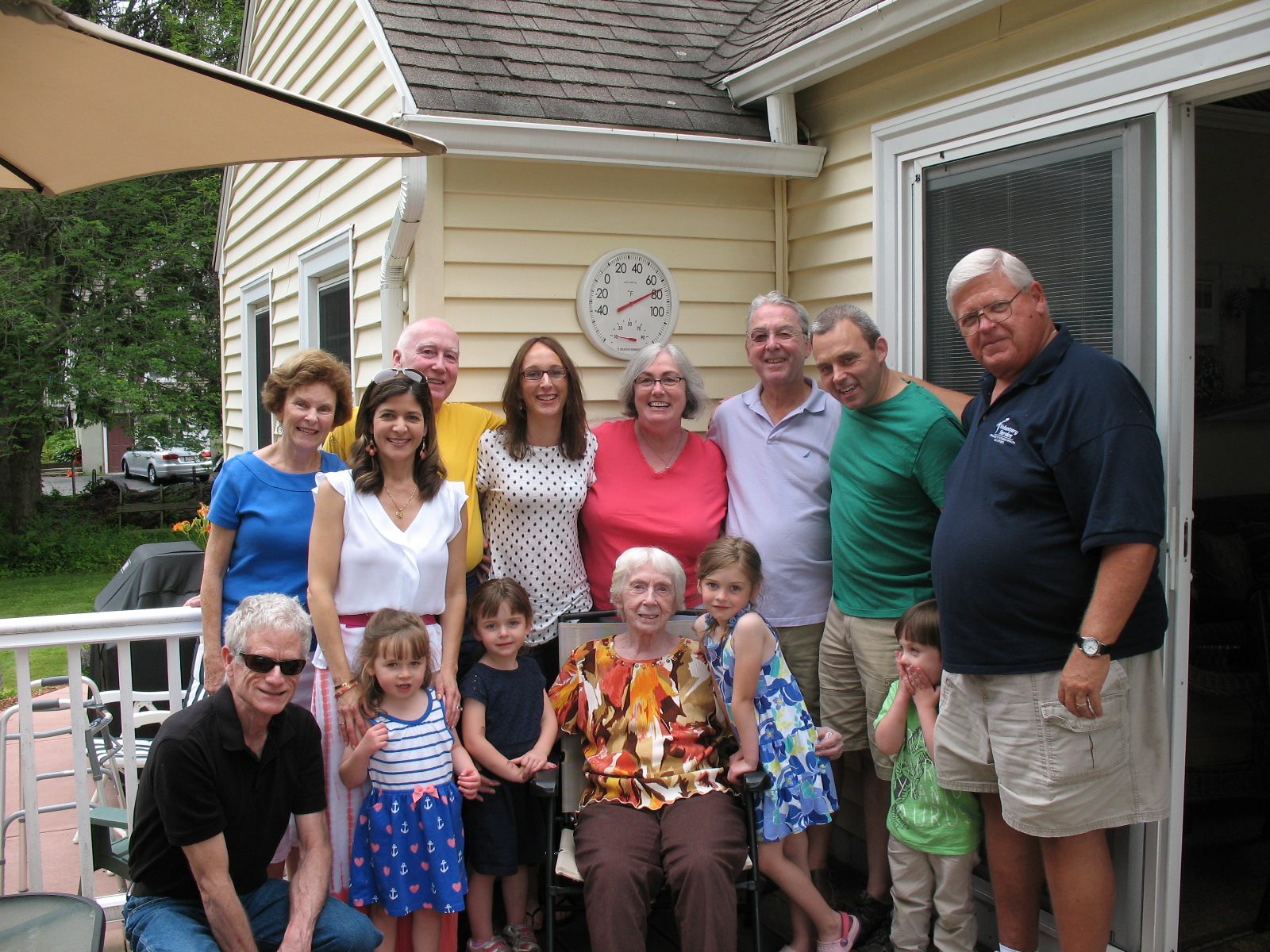 Here’s another great shot of this wonderful gathering.  Won’t bother labeling what are mostly strangers to all of you, but will say amongst these are brother George’s two married children, Emily and Justin, and their kids.  So that’s Mom there surrounded by four of her great-grand-kids.  We’re told she had a great time.  We love them all so much and truly enjoyed them sharing these pictures with us.