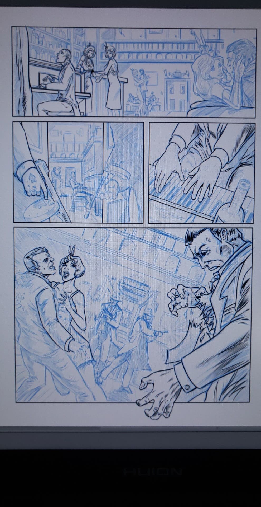 About a week ago we were thrilled to show all of you one of the new pages being worked on by graphic artist Jim O’Riley for the Brother Bones graphic novel. It is up on the left…and was done in soft pencils. To the right you see Jim beginning to digitally ink the piece. Upon seeing the original page, the Air Chief suggested Jim have the men lose their hats, as the scene is taking place indoors and it would not have been natural for them to have kept on their fedoras. Jim happily obliged. Note the two gunmen shooting up the place, have just come in through the back door and thus they alone have on their hats. We know, small item, but it in the details that things either work or do not. As for Jim’s art, it is truly amazing. We’ll continued to give you sneak-peeks like this as the project progresses.