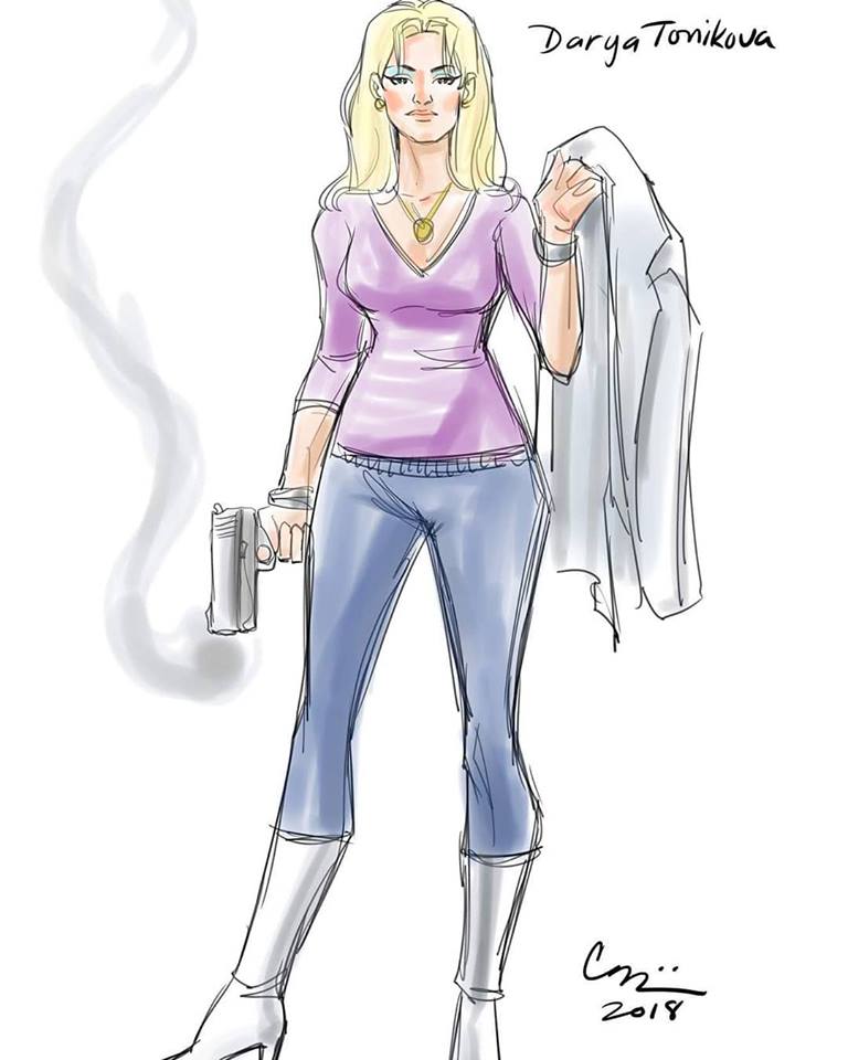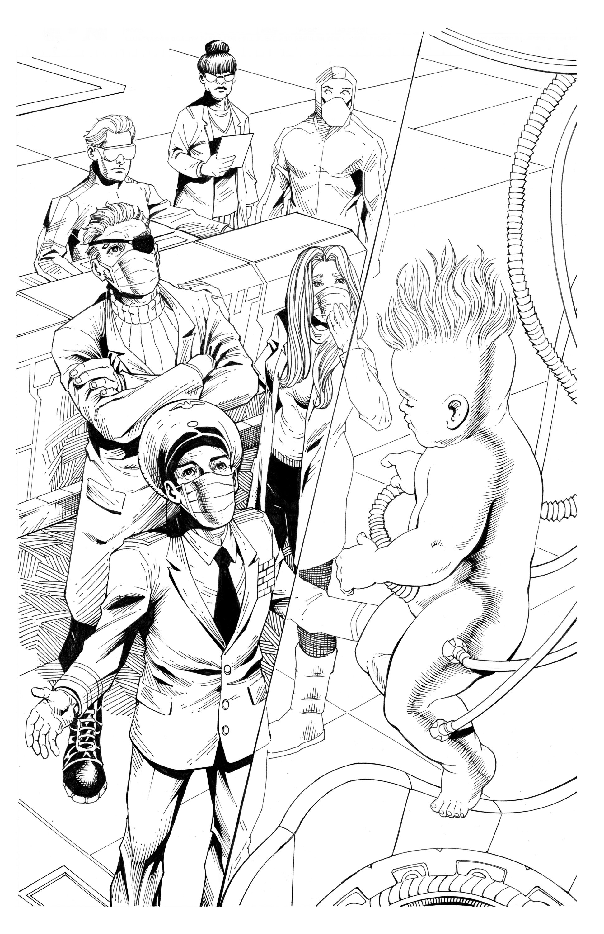 And super draftsman Cesar Feliciano just completed Pg # 34 of our JIN & TONIC\K first issue. This one dramatically presenting for the first time ever, Russian super soldier, Darya Tonikova…in her embryonic artificial womb. Talk about a money-shot. While to the right is an old sketch Cesar had done up way back in 2018 when this project was also in its infancy. We are still on the hunt for a super talented colorist to join out team. Stay tuned, Loyal Airmen.