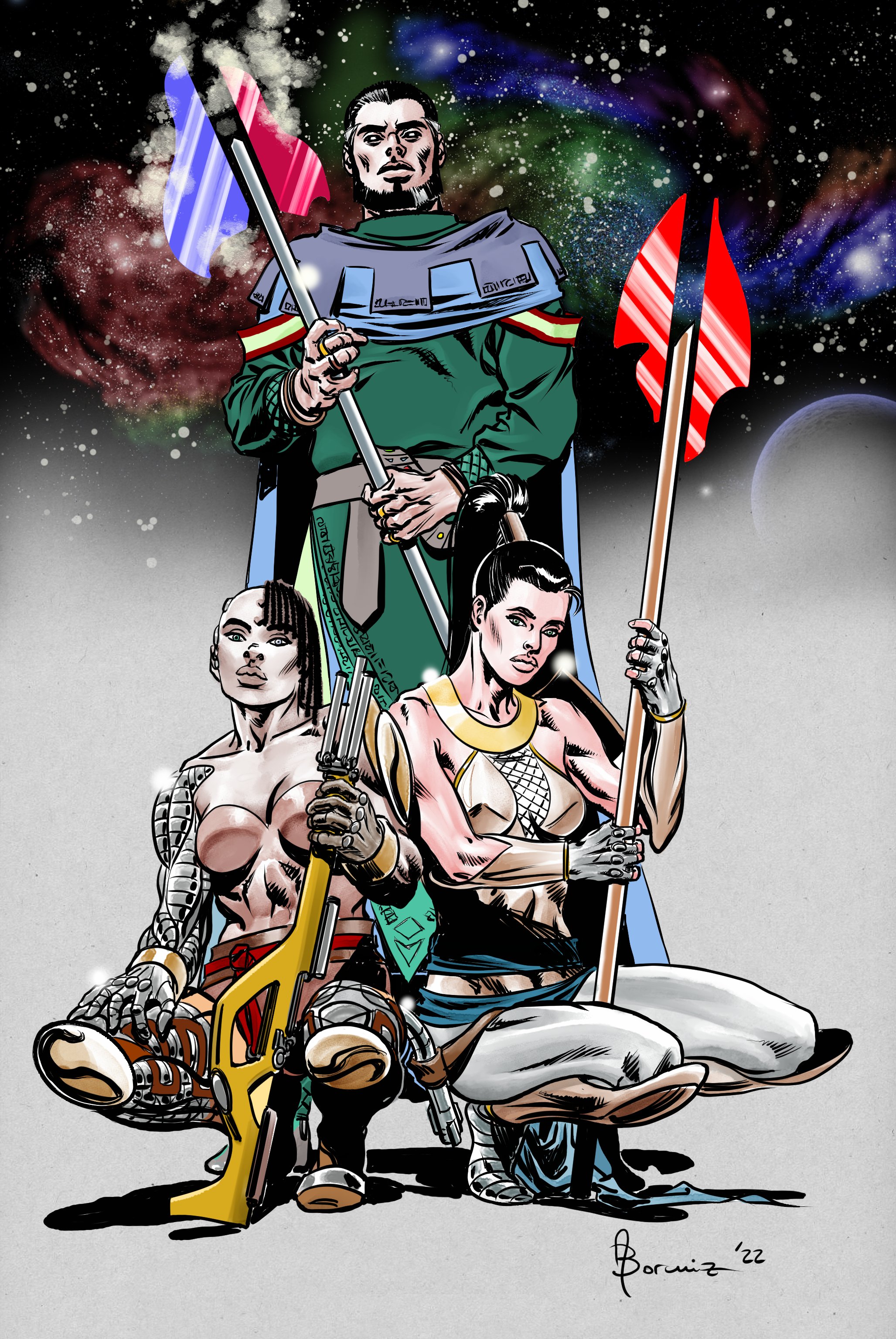 Those of you who were so generous to support the Kickstarter campaign for this comic, will know that one of the very first Stretch Goals to be met was that a Beyond the Stars trading card would be produce and go out to everyone who pitched in. Above is the finished image for the card, which is now in its final stages of production. It features Master Scientist Ar-Nall with Cyborg Science Warrior IS-Brt (0n left) and Chief Science Warrior Kal (on the right). There will be added logo on this front and text on the back. Gonna be a nice collectible when finished. Oh, yeah.