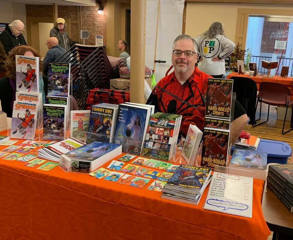 One of the earliest friends we made was writer John Simcoe. This past weekend, John was one of several guest at small writers show in Northern Pennsylvania. There he is above with his table full of amazing works, including our LEGENDS OF NEW PULP FICTION of which John was a contributor. So while setting up at the show, John comes across a table on which is displayed our latest Domino Lady anthology.