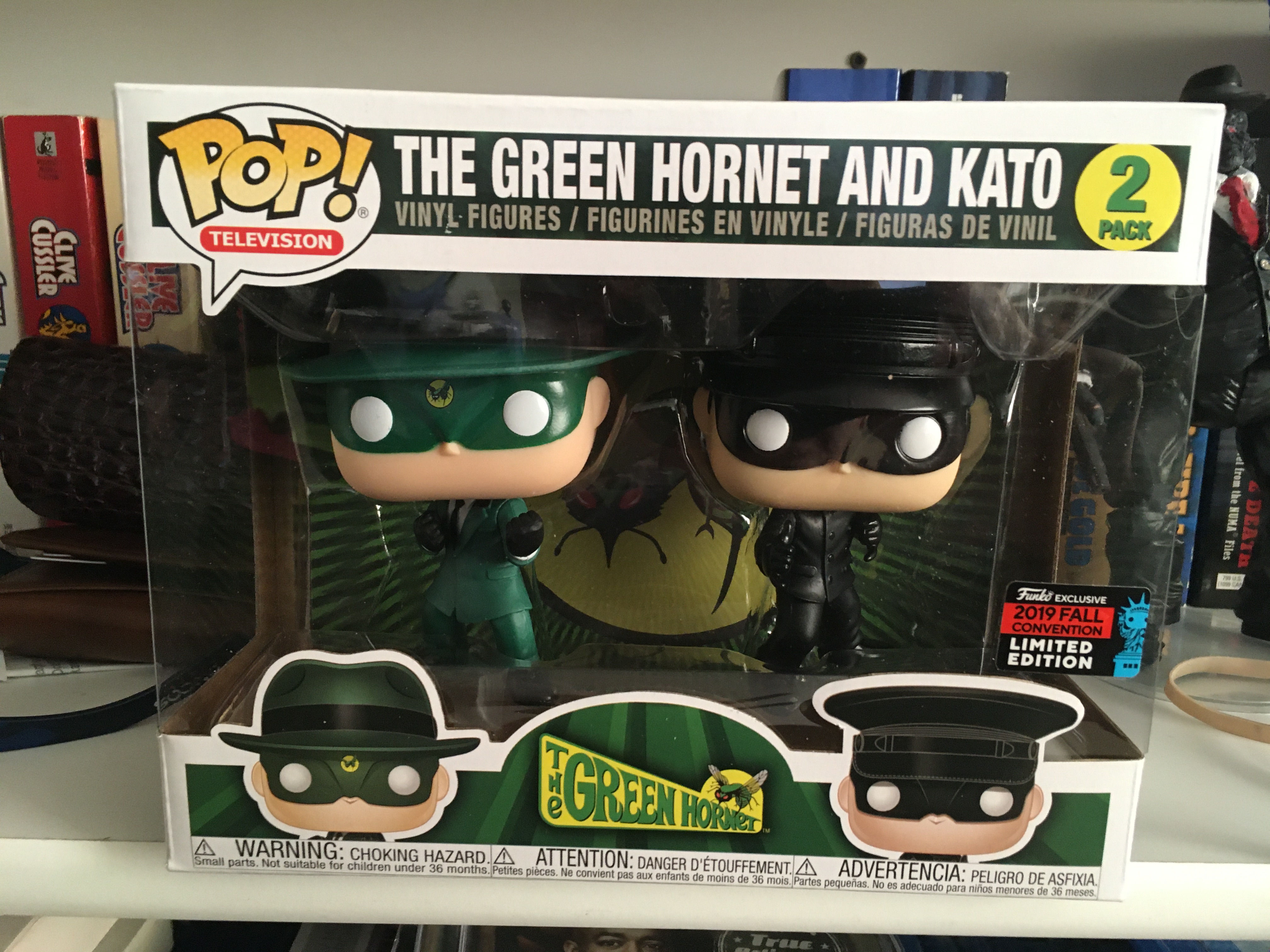 Since moving to Colorado over ten years ago, the Air Chief has made quite a few friend but none more so than Todd Jones and James Gaubatz. In fact we three meet one a week at a local bistro for coffee. Well actually the Air Chief has coffee, James is a tea-guy and Todd usually has an energy. You see we’re all into comics. A few years back Todd and James created WICKED AWESOME TALES and began publishing their own comics. They’ve even been gracious enough to publish several we wrote. So this past week as we were heading for the parking lot, they had me follow them to James’ Datsun. Knowing our birthday, 5th of Nov, is just around the corner, they went out and bought me a surprise gift. About a year ago the Air Chief had bought a POP Green Hornet figure on-line. Sadly we just couldn’t find one of Kato and honestly thought we never would. Well, as it turned out, James happened to be in our Fort Collins Barnes & Noble book store and he saw a POP 2-Set with both of them. He immediately called Todd and Todd told him to buy and they would split cost…then surprise me. Which is what they did in such a big way. And here’s a photo of that set. We’ll take out of the box eventually when we decide where in the office we want to showcase.