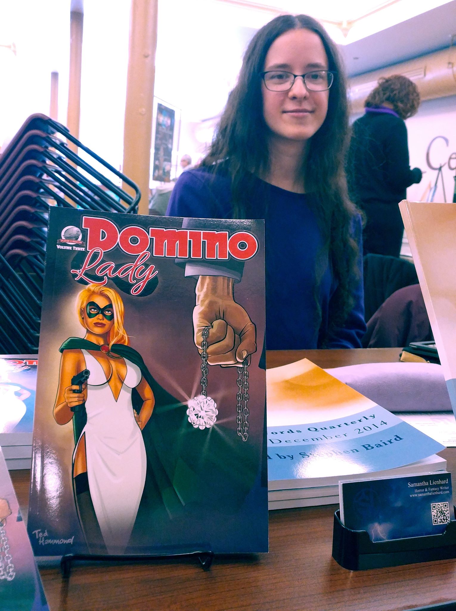Behind that desk was one of Airship 27’s newest writers, Ms. Samantha Linehard. John introduced himself and then snapped the photo above and sent it along to us. We were thrilled to see it and very happy to know Samantha is out there promoting her Domino Lady story in that volume. Samantha was finishing her College Master’s program in Fiction Writing a year ago when she had the pleasure of hearing super New Pulp writer Fred Adams Jr. give a lecture on New Pulp at her school. After the talk, Samantha approached him and expressed her interest in this new pulp stuff. God Bless Fred, he encouraged her to contact the Air Chief and happily she did.