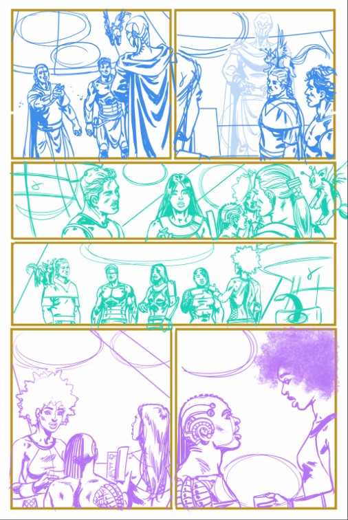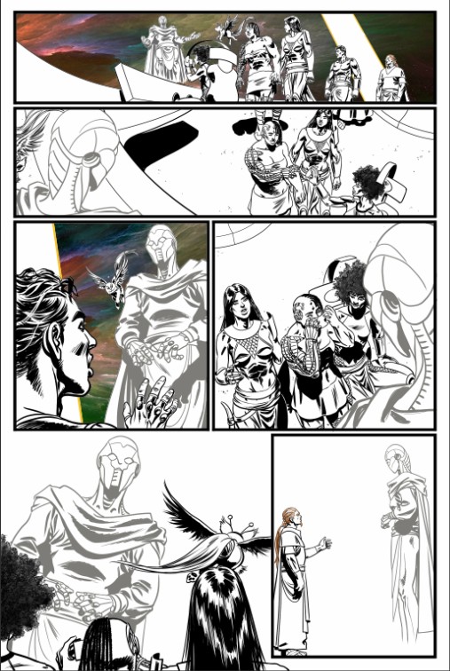 Meanwhile Italian artist continues his masterful work on our BEYOND THE STARS. Here are the pencils and inks for Issue # 4’s pg 14 and the pencils for pg 15. We so love Andrea’s work. More to come Loyal Airmen.