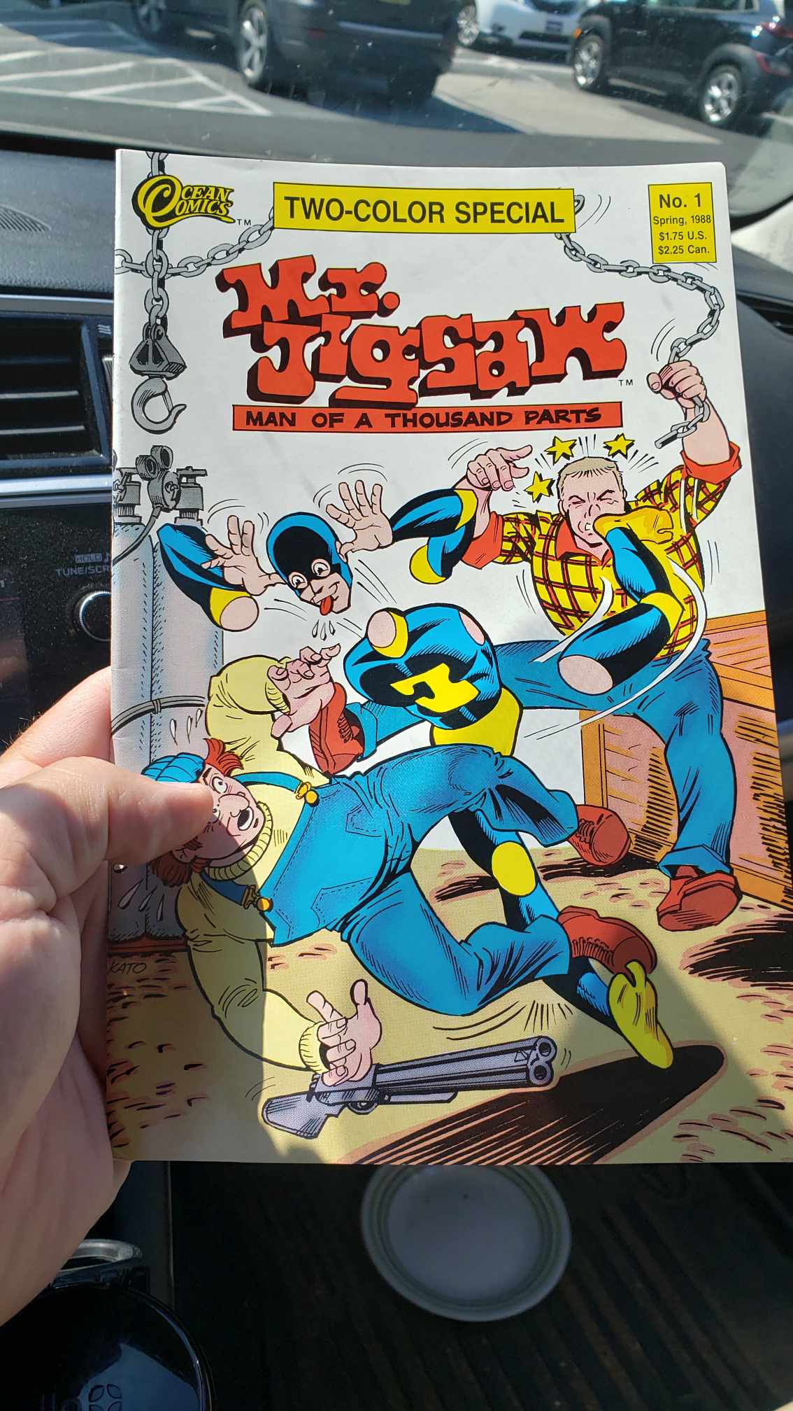 So last Sunday, Father’s Day, a colleague, writer John Simcoe, and his wife, were browsing through an antique store and he came across boxes with comics. He started digging through and lo and behold comes across an early Ocean Comics edition of our Mr. Jigsaw – Man of a Thousand Parts. John was tickled and sent us the attached picture. He bought the issue, read it and said it was lots of fun. Thanks, pal. Great story. Nice to know some of those early issues are still out there.