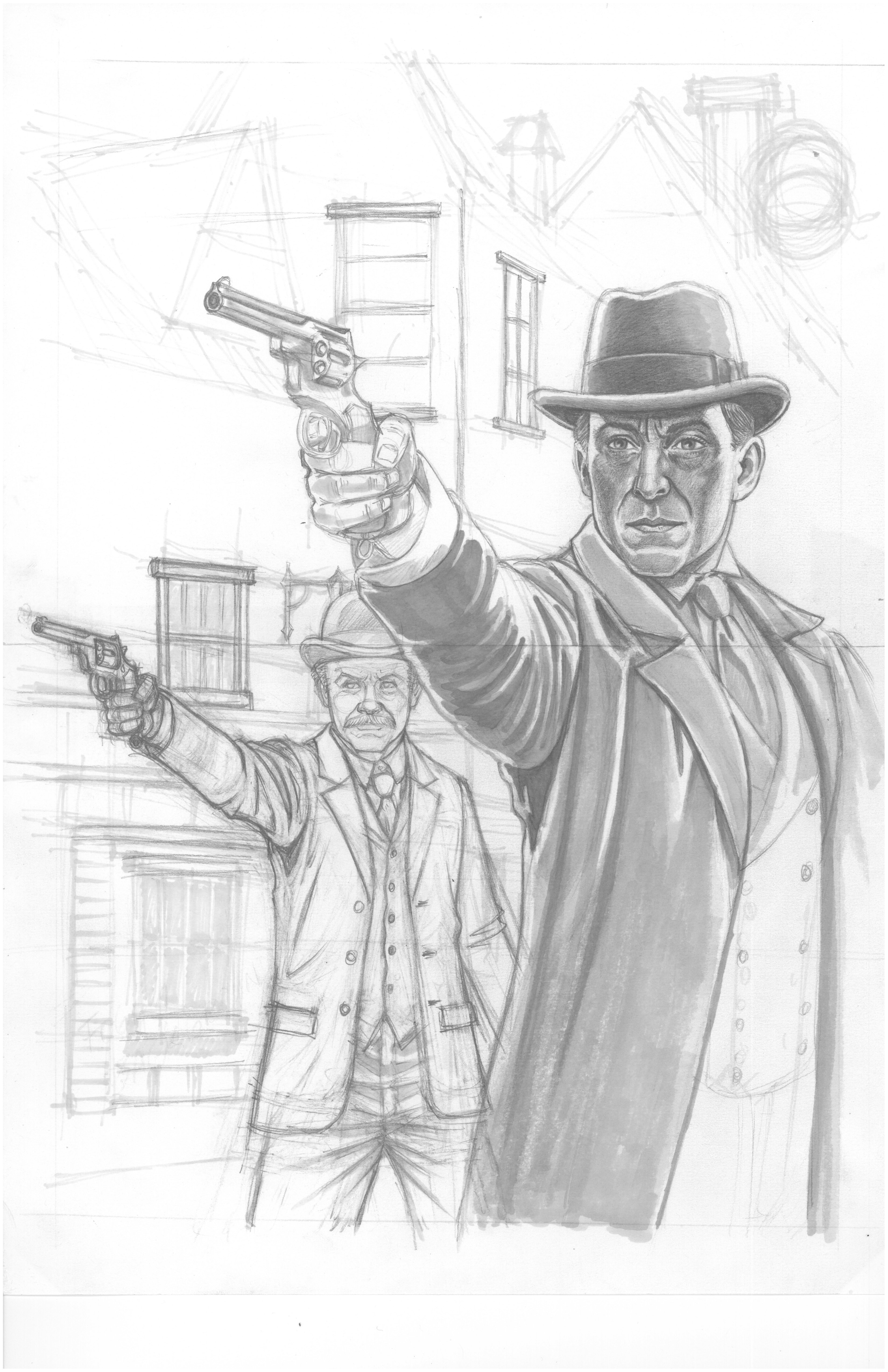 We’ve already shown you some of Rob Davis’ marvelous interior illustrations to our next pulp release, SHERLOCK HOLMES – CONSULTING DETECTIVE Vol 7. Above is a peek at the start of the cover to be painted by artist Michael Youngblood. Rob assisted Michael by doing up a rough sketch which Michael tend took did his own complete version. Of course whereas Rob’s favorite actor to portray the great detective was the late Jeremy Brett, it is no coincident that this particular Holmes will look a whole lot like that wonderful actor.
