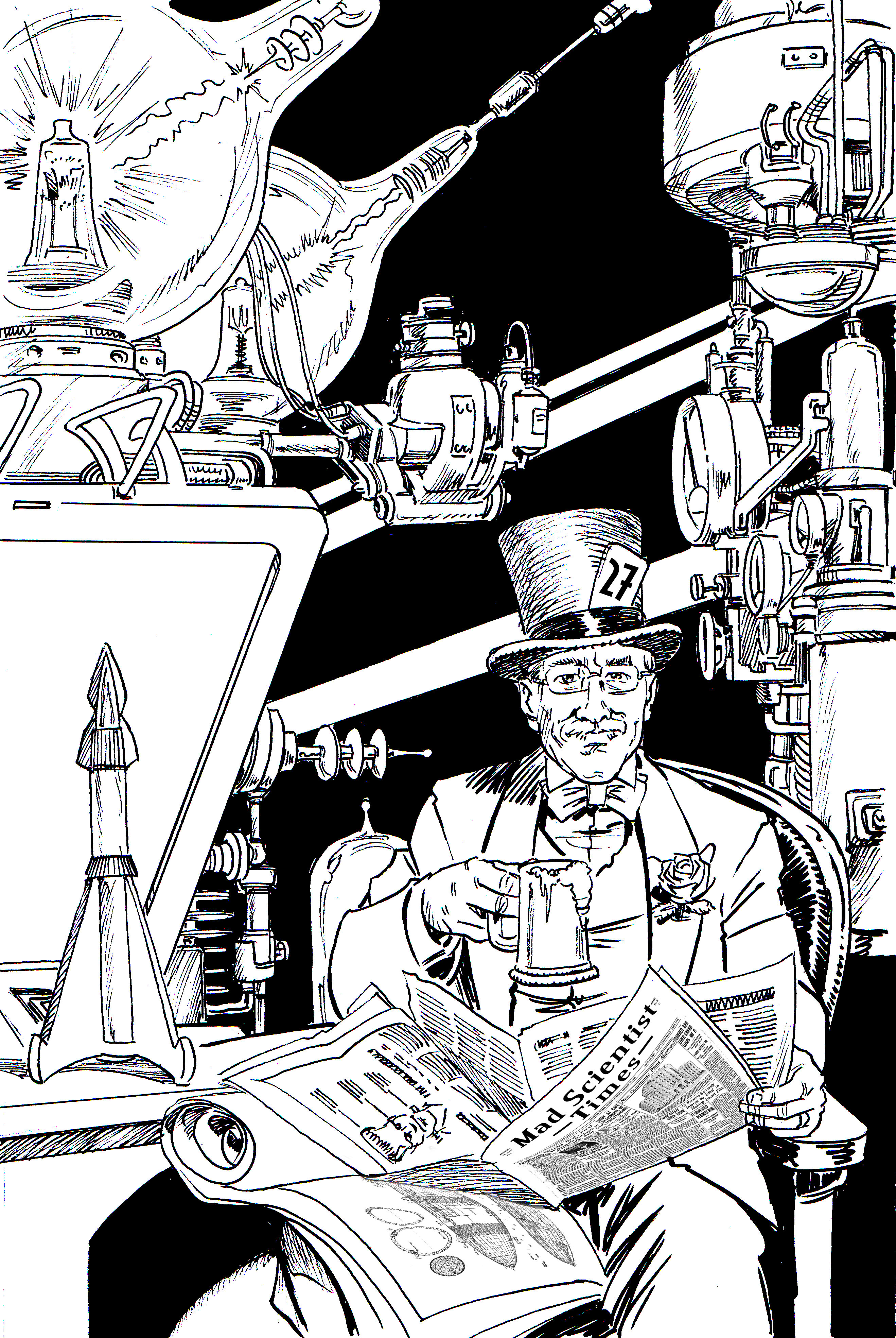 As you know, every now and then we like to give you Loyal Airmen a few sneak peaks at up and coming projects.  So take a gander at the two cover pencils above.  The one on the right is for the new pulp novella we wrote last year for Moonstone Books called FACES OF FEAR and it teams the Black Bat with the little known pulp hero, the Purple Scar.  Moonstone is on the last stages of assembling the project and as soon as we have a date for its release, and a finished colored piece, you know the Old Air Chief will post it right here.  And speaking of the Ye Old Air Chief, to the right you’ll find him seated in his private lab enjoying a beer and the local scientific journal…all courtesy of artist Rob Davis for the forthcoming issue of “RON FORTIER’S TALES OF THE MACABRE” # 6.  And again, as soon as the comic title is out and available, we’ll give you all a heads up.