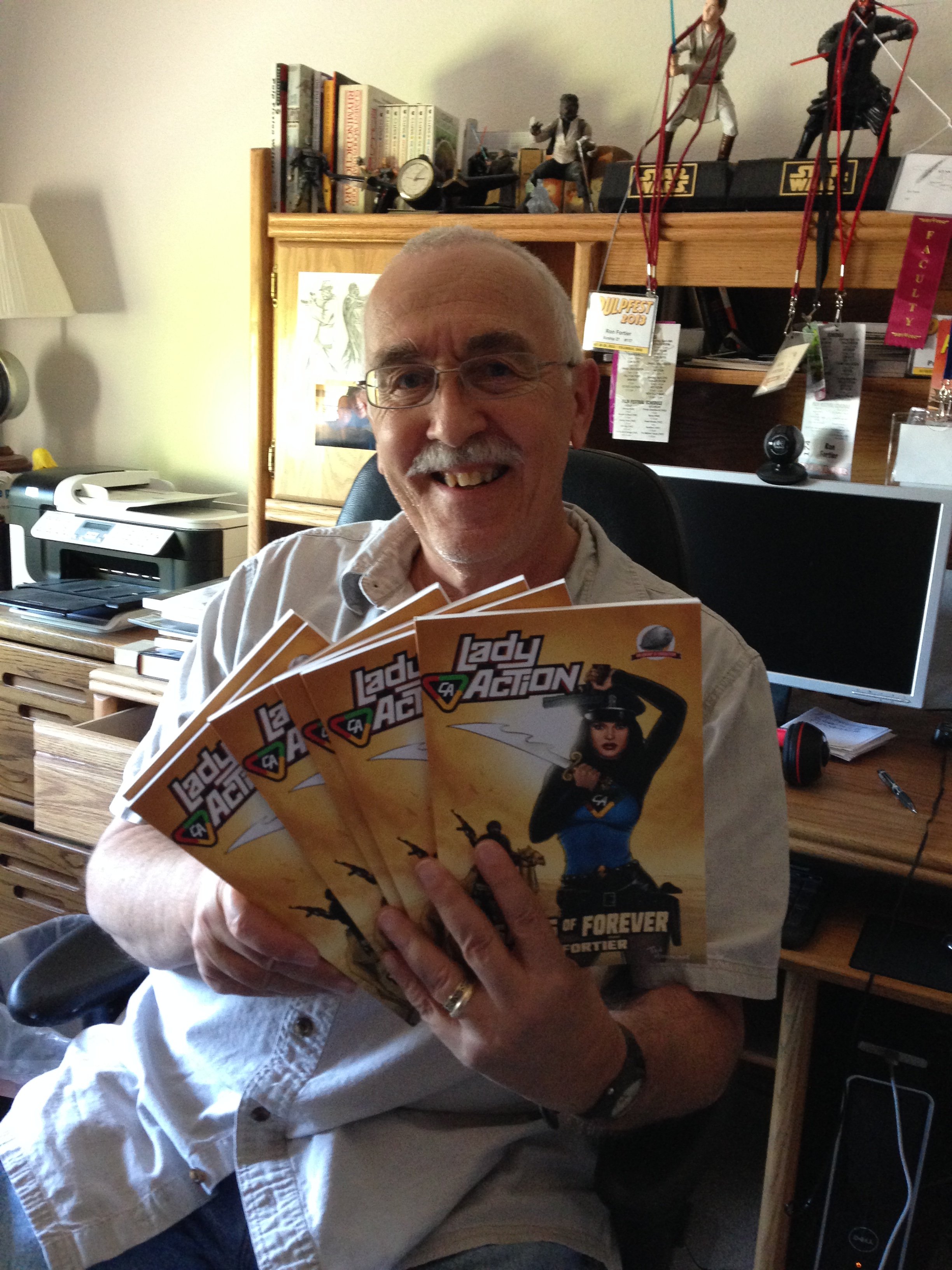 One of the greatest joys for any writer is seeing their work in print. After months of writing something, proofing, correcting etc.etc., the at long last get to hold it in your hands is just a sheer delight. Such was the case this week when the Air Chief received his copies of his latest pulp novella, LADY ACTION – Sand of Forever. Here we are in the office proudly showing them off. And we’re told, this has been our hottest seller over at Amazon thus far this month. For that, we say to all you Loyal Airmen, thank you so very, very much.