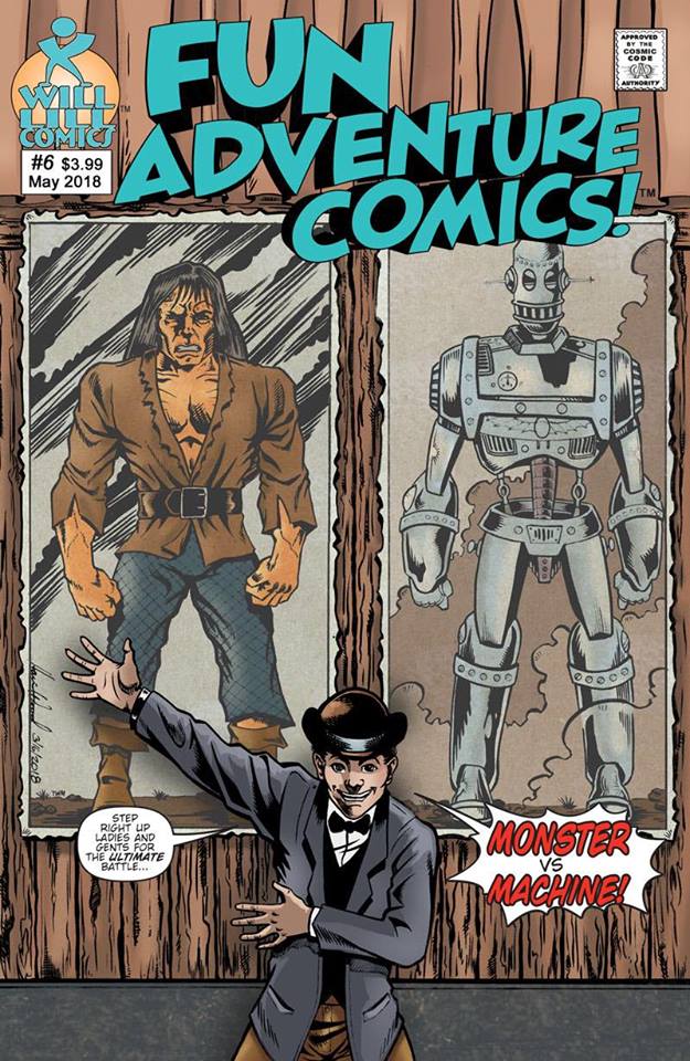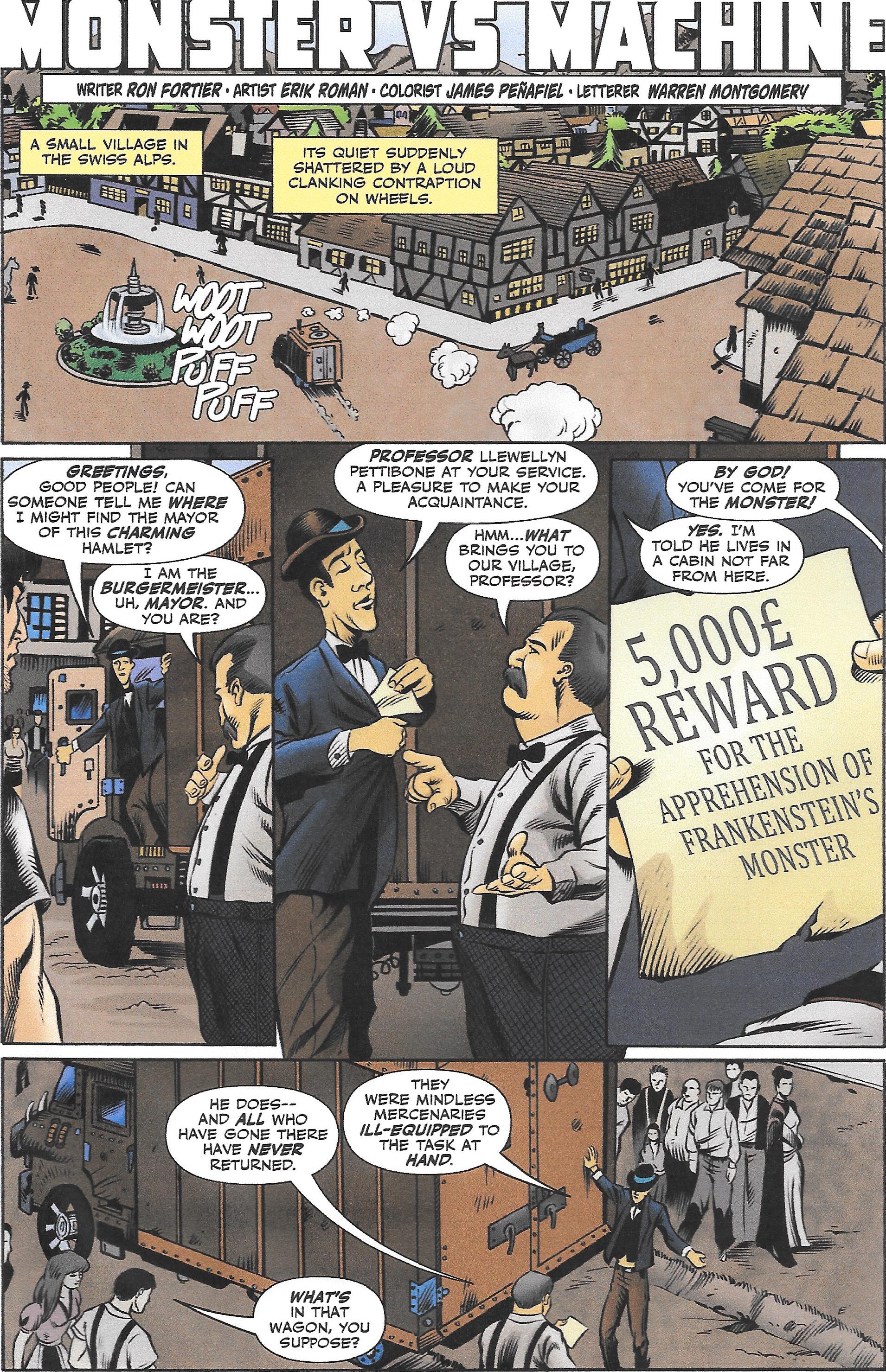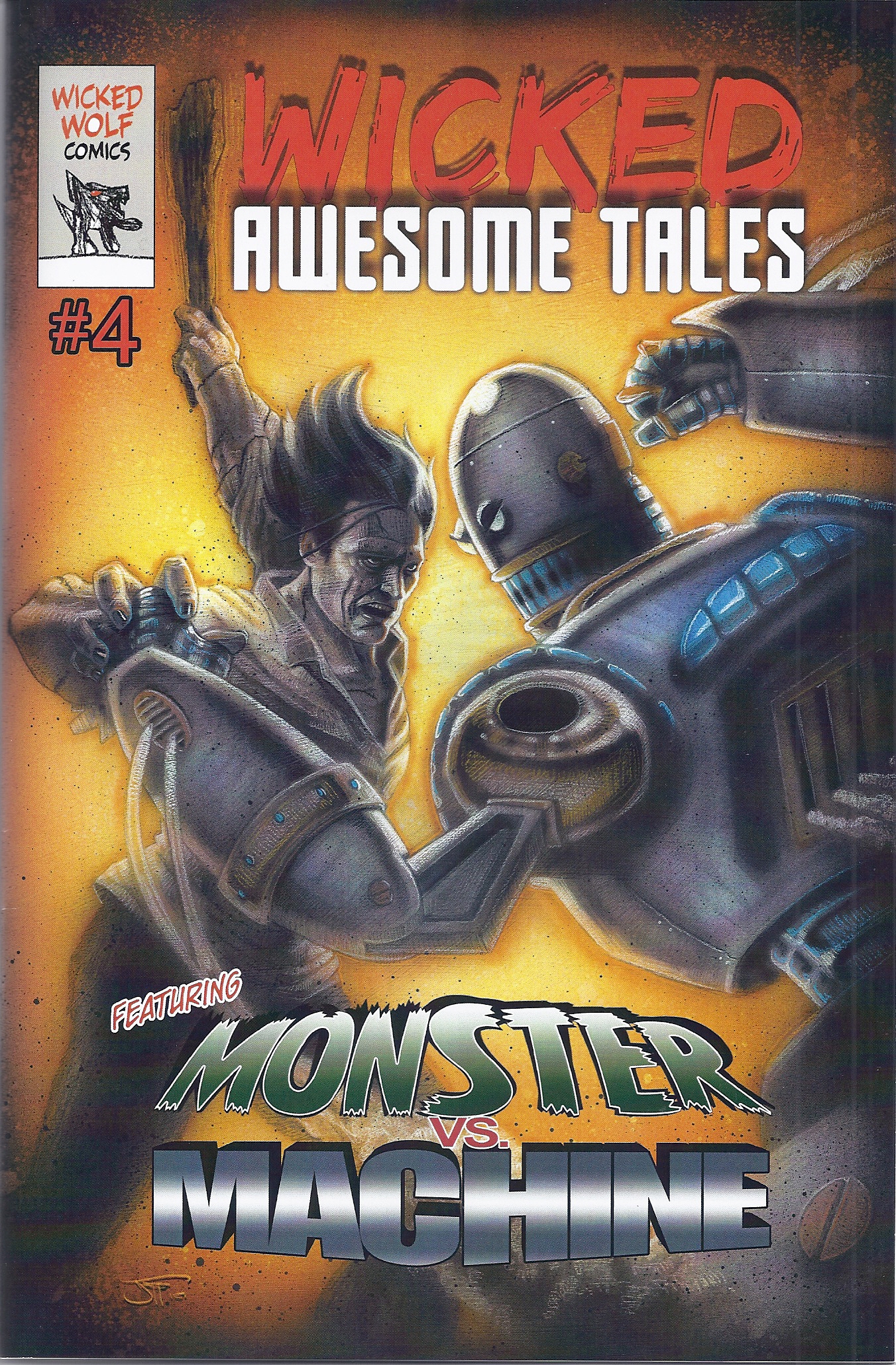 One of the things the Air Chief loves to do is write short strips and then let his friends and colleagues have them for their own small independetn titles.  Such was the case several years ago when we penned, “Monster Vs Machine,” an eight page tale wherein Frankenstein’s Monster battles a steampunk robot. We were able to recruit super artist Erik Roman to draw the strip and our buddy WarrenMontgomery to letter it. It then appeared in issue # 5 of Redbud Studio’s RON FORTIER’S TALES OF THE MACABRE with a cover by Rob Davis.  A few months later, Todd Jones, another pal, asked if he could use in his own black and white anthology, and it appeared WICKED AWESOME TALES # 4 with a cover by Jeff Herndon. Now that was well over a year ago.