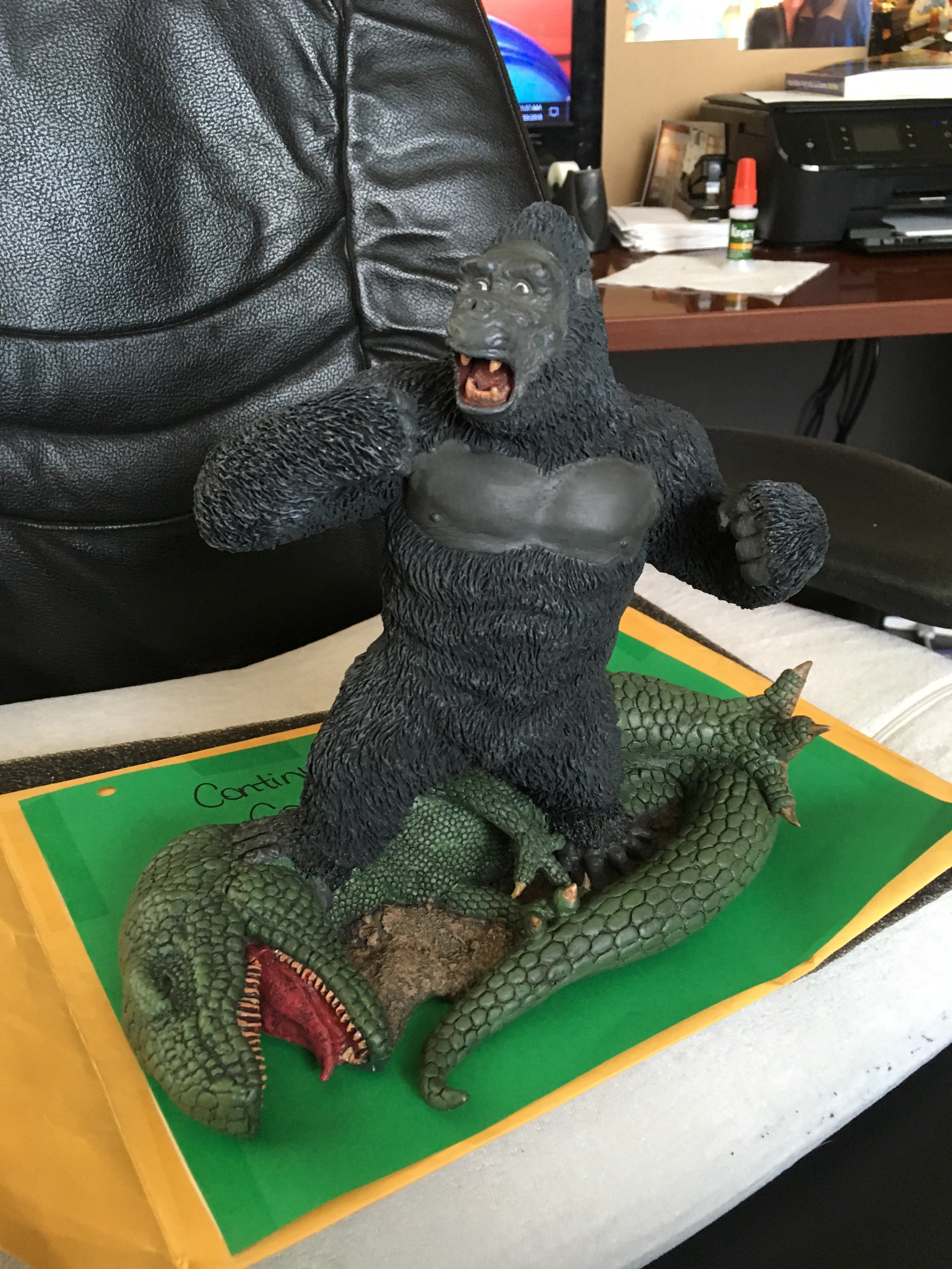 At the same the Air Chief found this tin treasure, we remembered that still left undone back in the office as a spectacular King Kong resin model kit given to us for Christmas by writer pal, Michael Housel. Ergo we vowed upon getting back home, we’d make time to put that model together.  And today we did just that. Thankfully the kid itself came pre-painted and with only five pieces to glue together. Took us all of ten minutes to assemble, and yes, we should have done it months ago. Above is the finished kit, it highlights the scene from the original movie wherein Kong has bested a T-Rex in combat and is beating his chest in triumph. Thanks Michael, for a truly awesome piece which also gets a place of honor in the Air Chief’s inner sanctum.  LONG LIVE KONG!!!