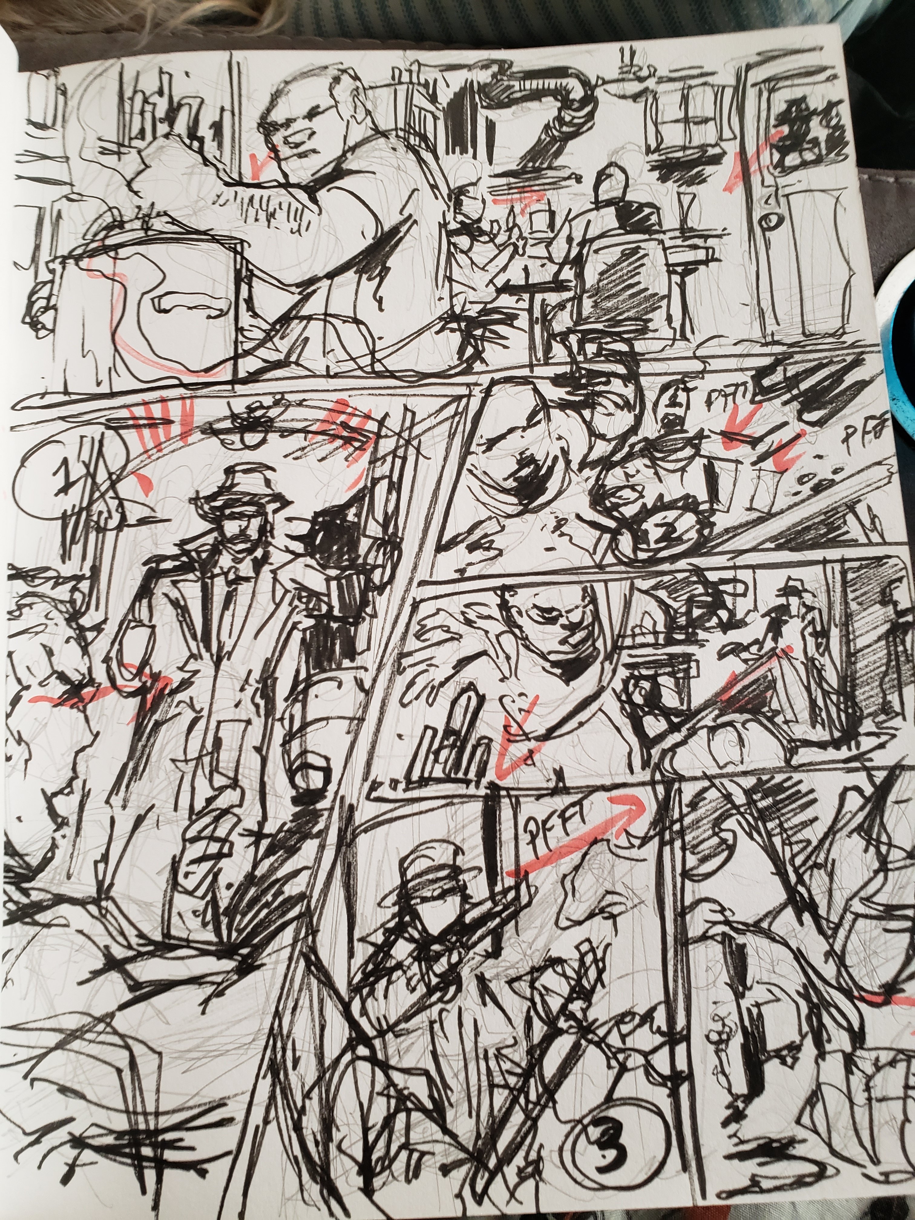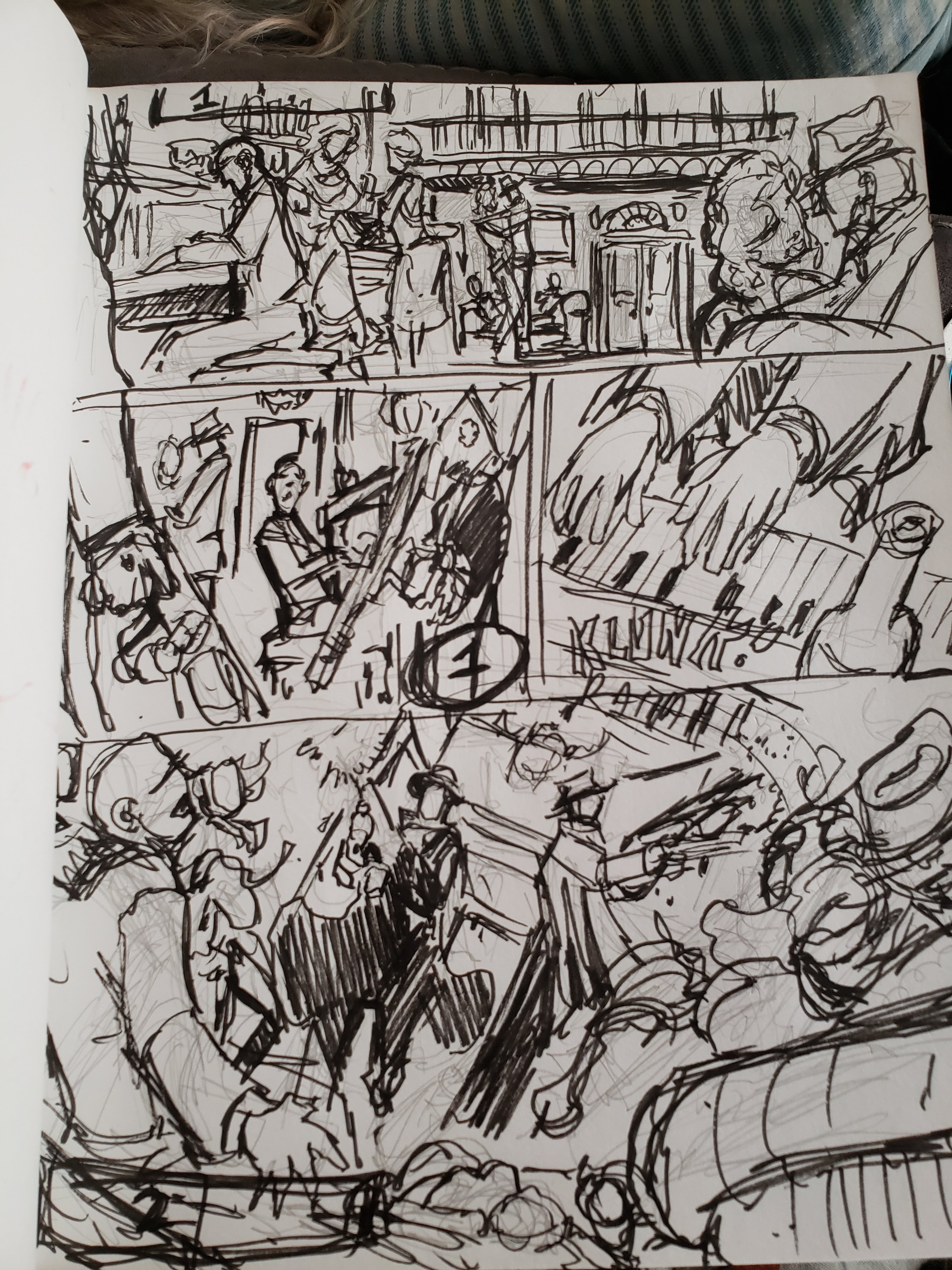 Meanwhile Jim O’Riley was working on “roughs” from our Brother Bones graphic novel script. Artists do up these roughs so as to see what the strengths and weaknesses are inherent in each page. Then learning that, they adapt the final pages to reflect the best compositions. Jim’s plan is to do “roughs” for ALL 130 pgs before he begins the final artwork. Now that’s dedication to one’s craft.