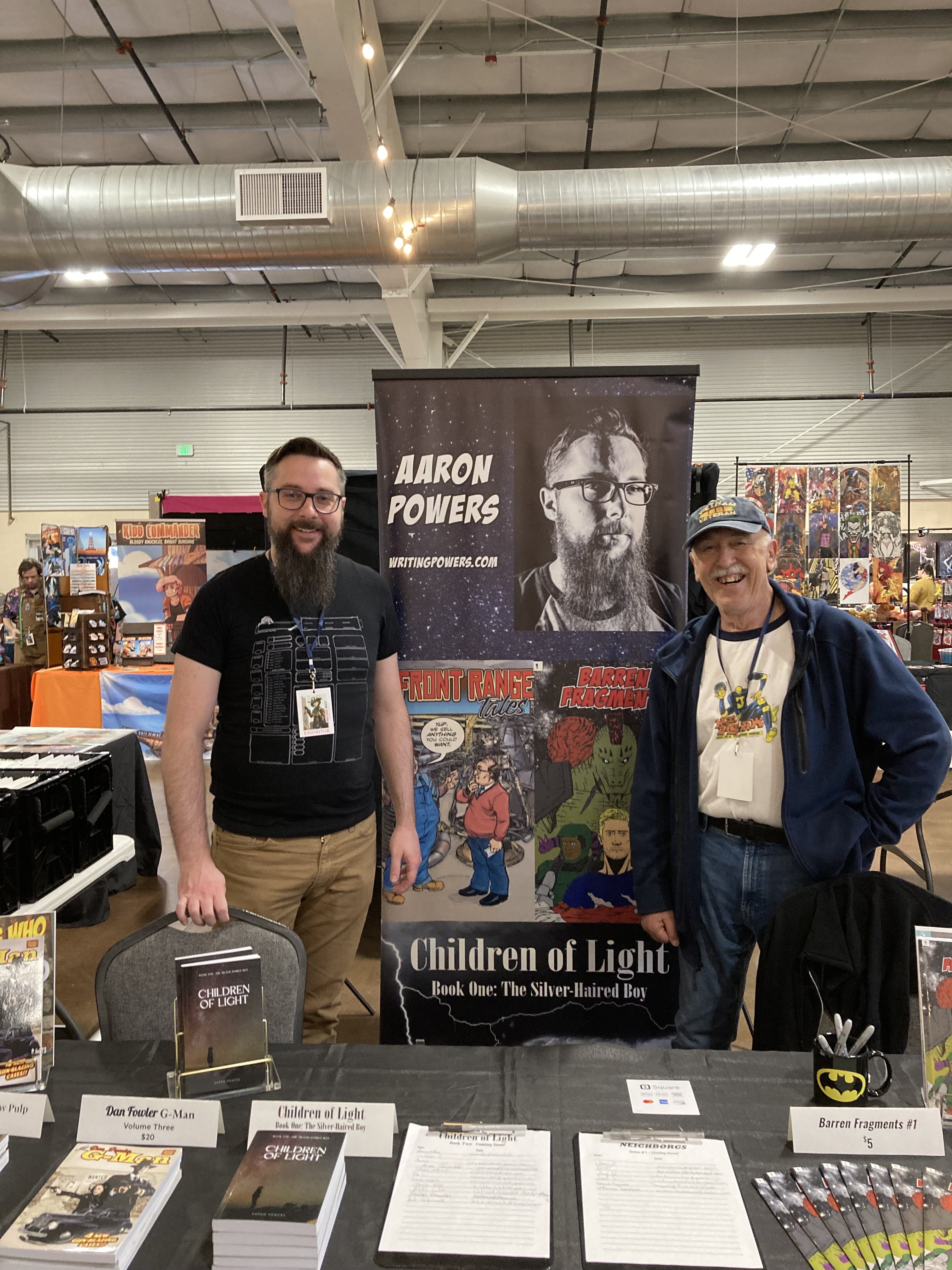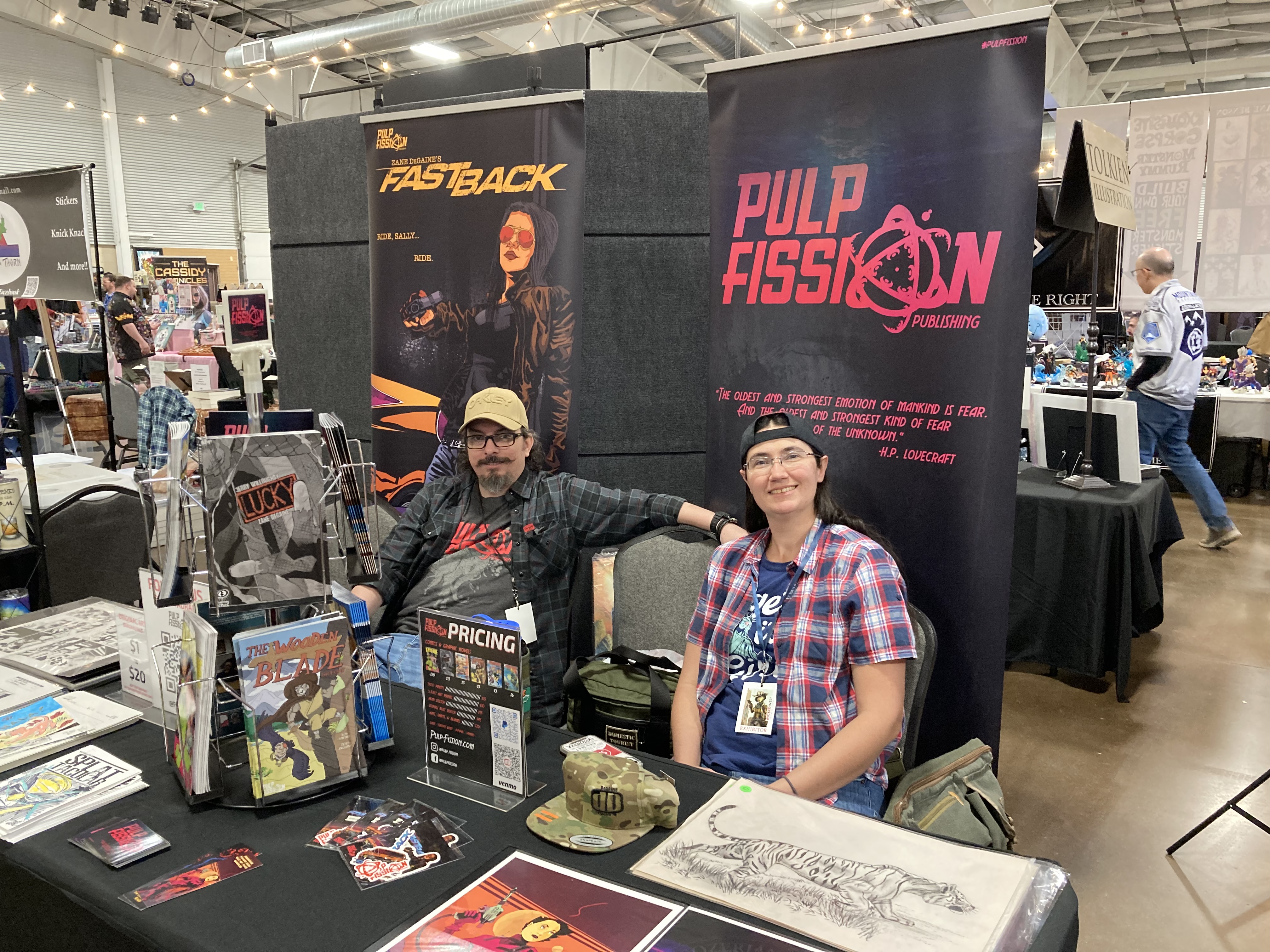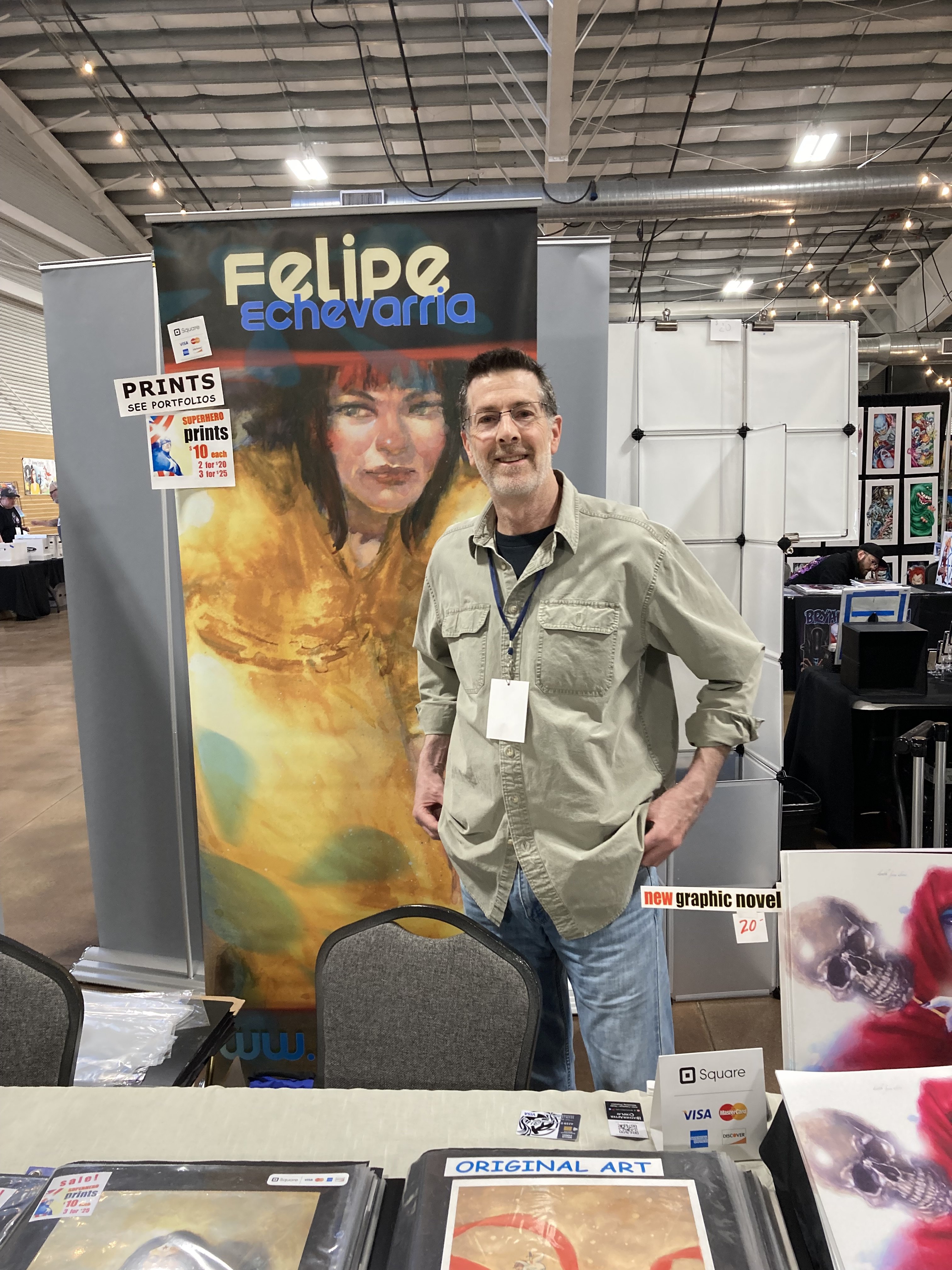 Two other con guests included Aaron Powers, a really terrific writer who does both comics and prose. He’s written for Airship 27 in the past and is currently working on another short for our Rick Ruby Private Eye. Series. To upper right, was a truly welcome sight, artist Felipe Echevarria, a dear friend who had, up until this weekend, been absent from the con circuit for six years. Having him there and getting reacquainted was a really joy.