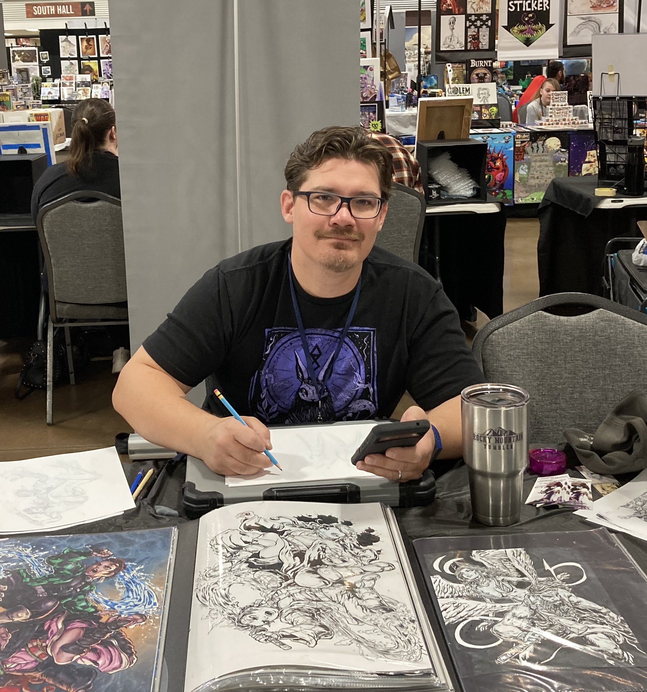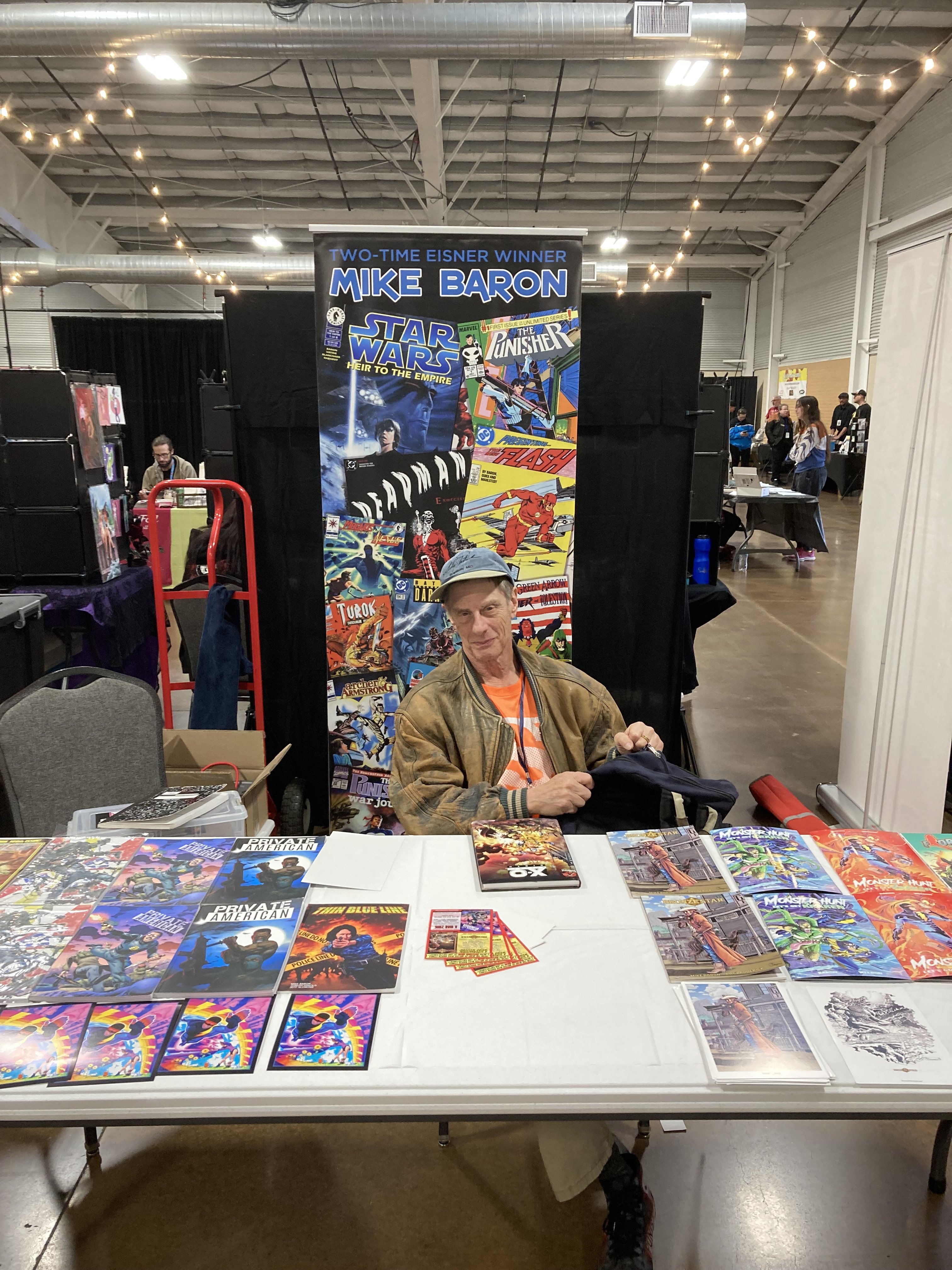 Across the aisle from us were Zane & Olivia DeGaine. The Air Chief is working with both these super talented artist on various projects. This includes the western comic project of which you’ll see pages below. To their left was legendary comics writer Mike Baron showing off a cool new con banner.