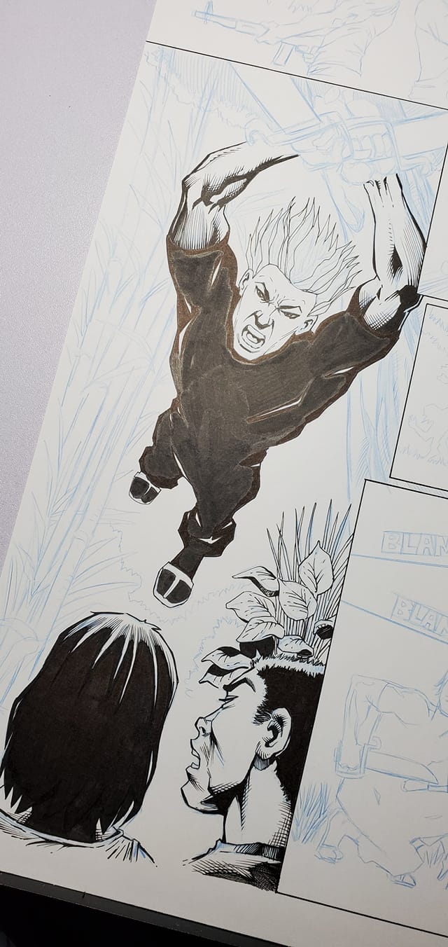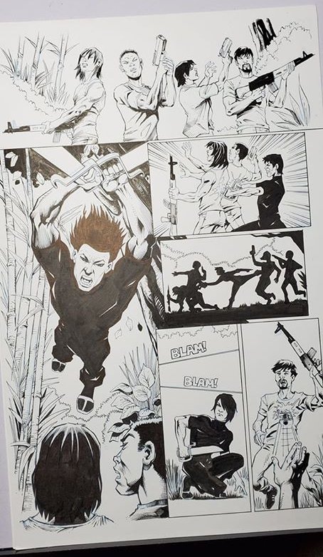 Last week we gave you a peek at a comic page being illustrated by artist Cesar Feliciano from our project JIN & TONIC. Well, Cesar completed this action packed page and it looks absolutely fantastic. We hope you’ll agree. All that remains to be added now is sound effects and colors. We are still extremely excited about this project and hope we can eventually get it in print. All fingers crossed.